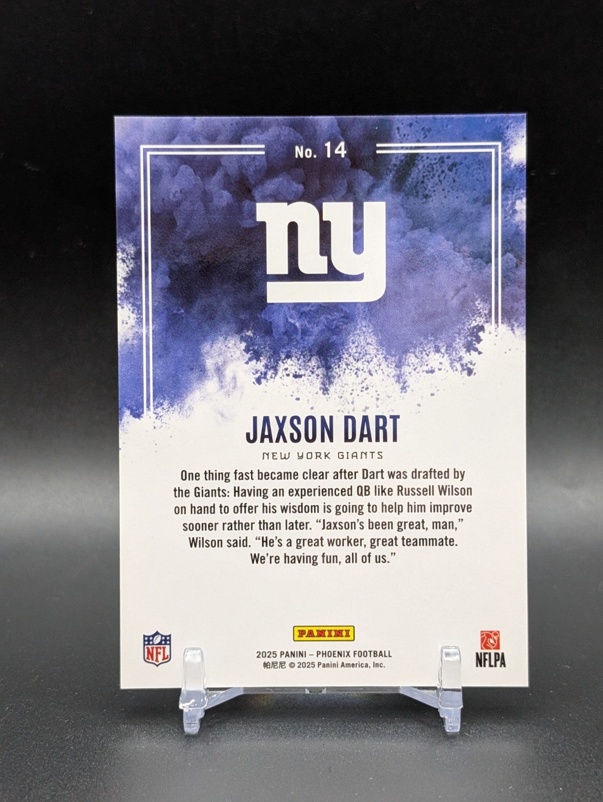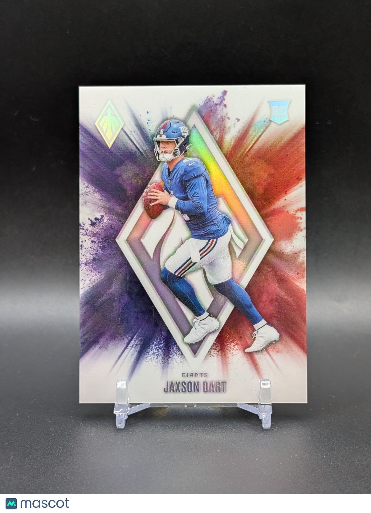 The 2025 Phoenix Jaxson Dart Color Blast RC Rookie SSP #14 trading card is a highly sought-after collectible for football fans and card enthusiasts. Featuring the talented rookie player Jaxson Dart, this limited edition card is a valuable addition to any sports memorabilia collection. With its unique design and exclusive team of the New York Giants, this card is sure to be a standout piece for fans of the sport. Listed With Mascot.