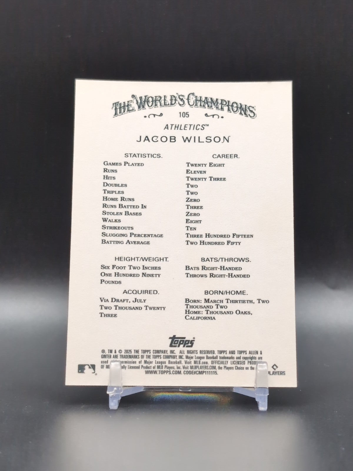 2025 Topps Allen & Ginter Jacob Wilson #105 Gold Foil Filagree /50 Oakland A's
