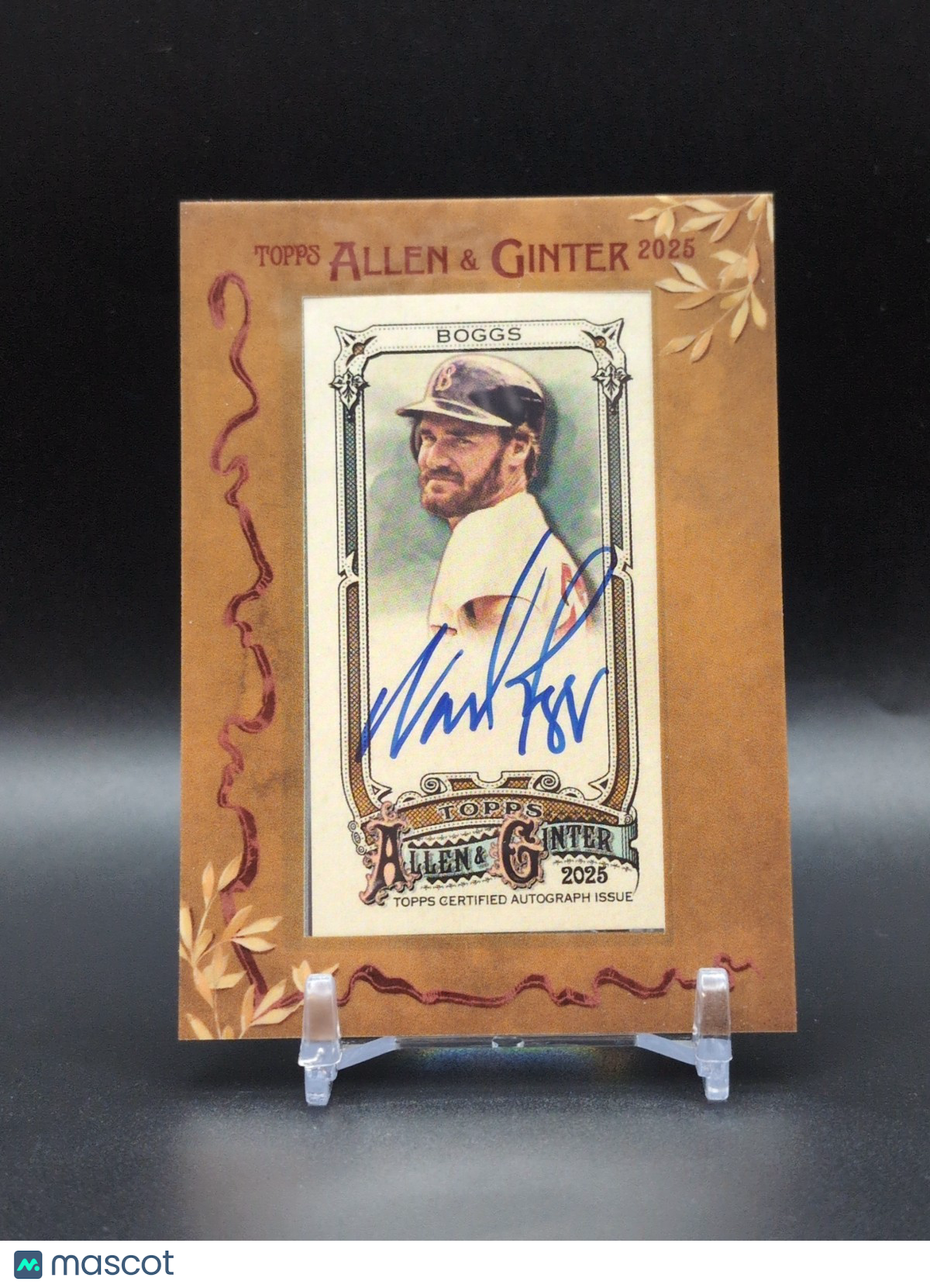 The product is a 2025 Topps Allen & Ginter Wade Boggs Mini Framed Auto trading card featuring the legendary MLB player, Wade Boggs. This hard-signed autographed card is made of card stock and includes a framed autograph authenticated by Topps. The card is a part of the 2025 Topps set and is in English language, making it a valuable addition to any baseball card collection. The card showcases Boggs' association with the Boston Red Sox, a prominent team in Major League Baseball. Listed With Mascot.