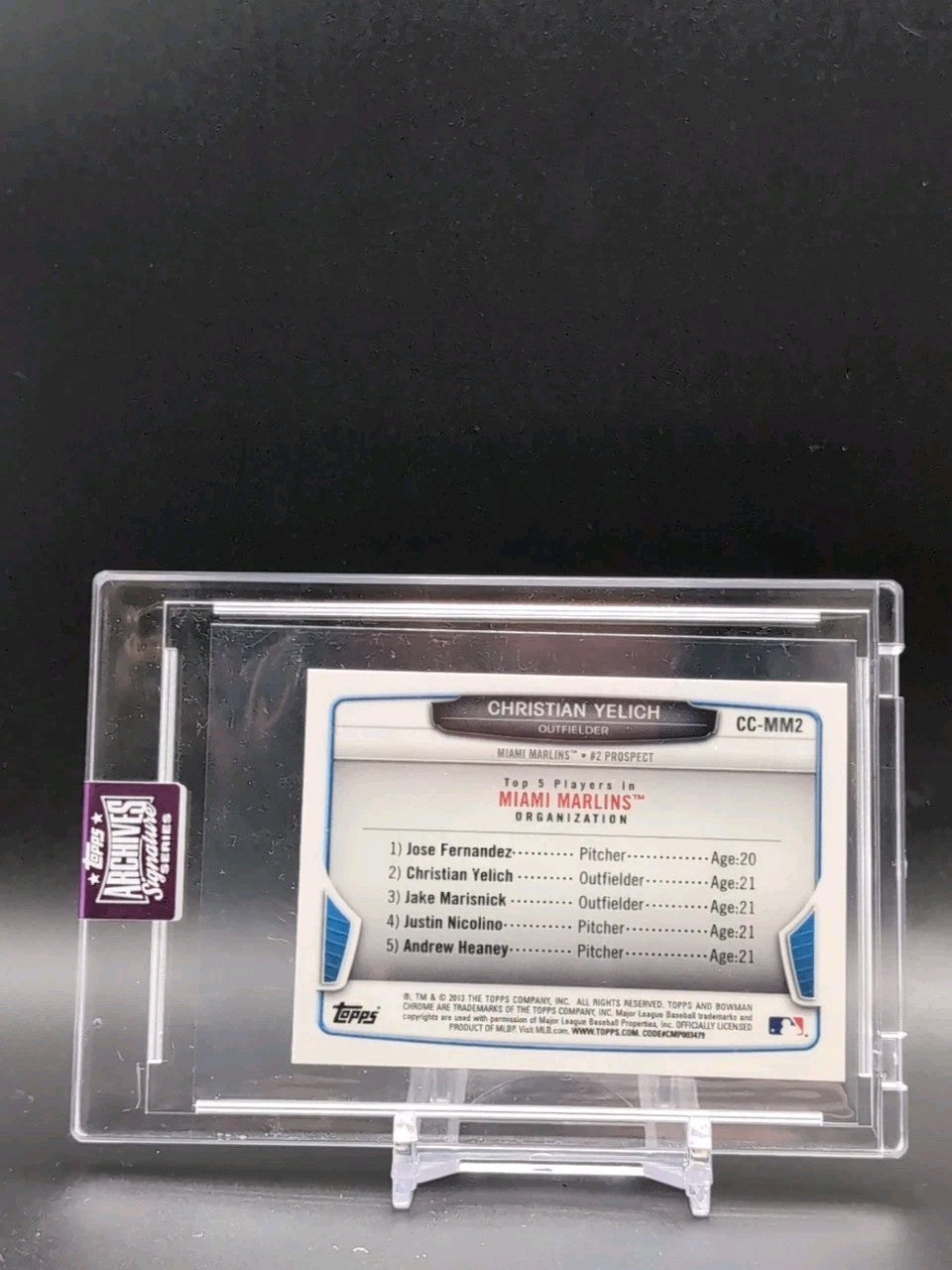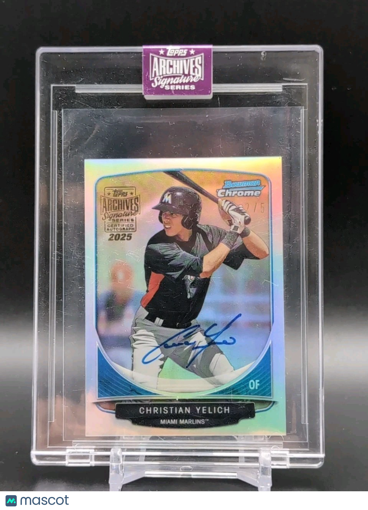 The product is a 2025 Topps Archives Signature Series trading card featuring an autograph of Christian Yelich from the Milwaukee Brewers. This card is a rare find as it is numbered out of 5 and comes with a hard-signed autograph, making it a valuable addition to any collector's sports memorabilia collection. The card is made of sturdy card stock and showcases Yelich's signature, adding to its appeal as a sought-after item for baseball fans and card enthusiasts alike. Listed With Mascot.