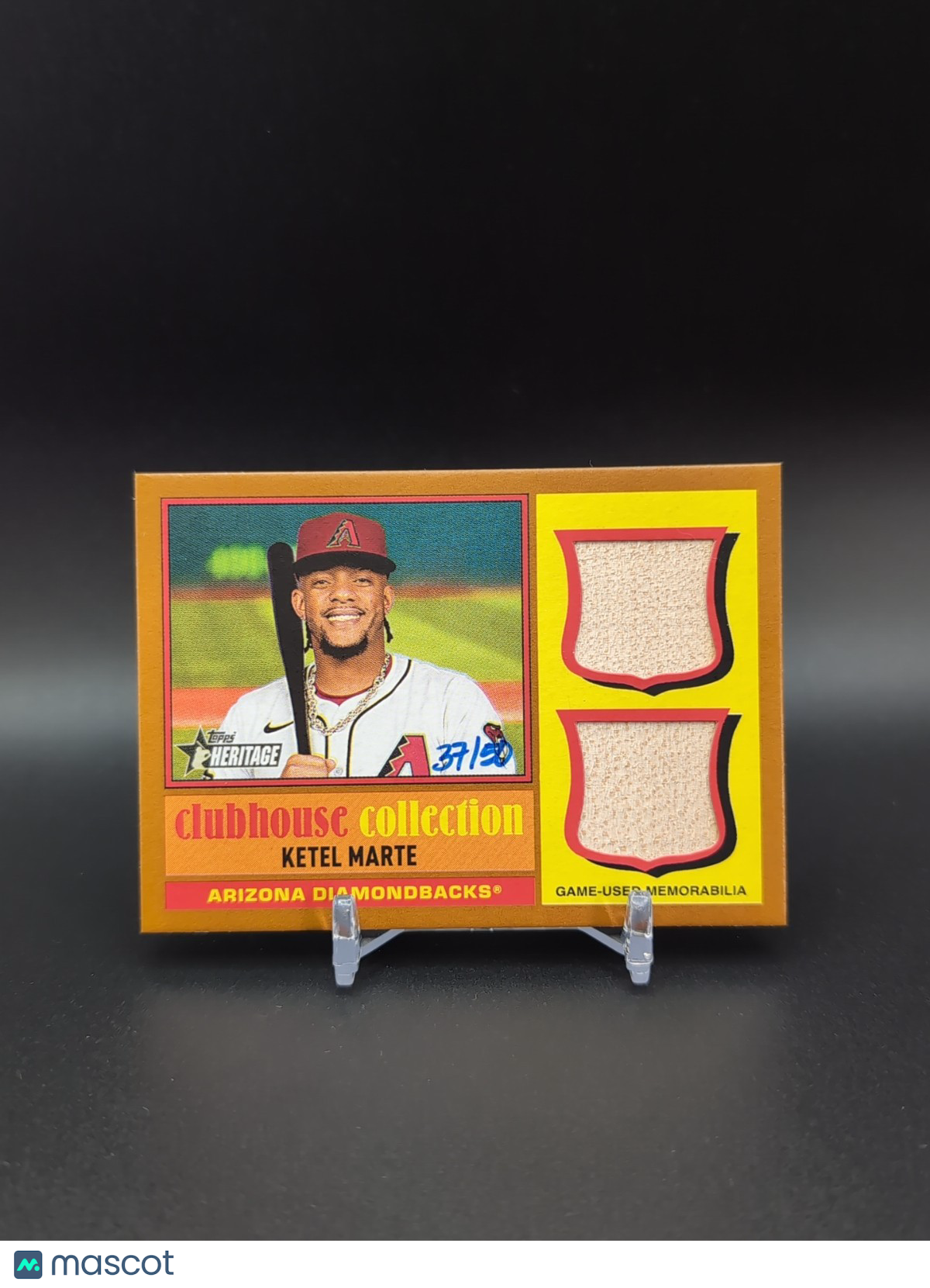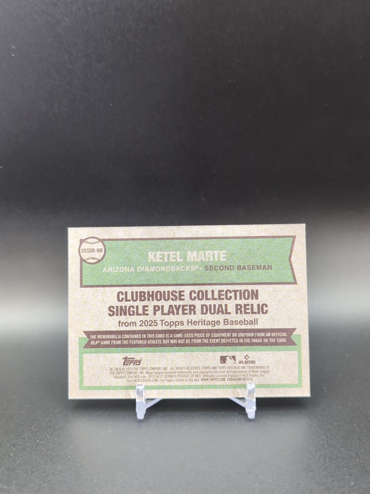 The 2025 Topps Heritage Ketel Marte Dual Clubhouse Collection Relic #CCSDR-KM is a highly sought-after sports trading card featuring baseball player Ketel Marte. Manufactured by Topps, this limited edition card is serial numbered out of 50 and includes a piece of game-used relic from the player's club uniform. It is a part of the 2025 Topps Heritage set, making it a valuable collector's item for fans of both Marte and the sport of baseball. Listed With Mascot.