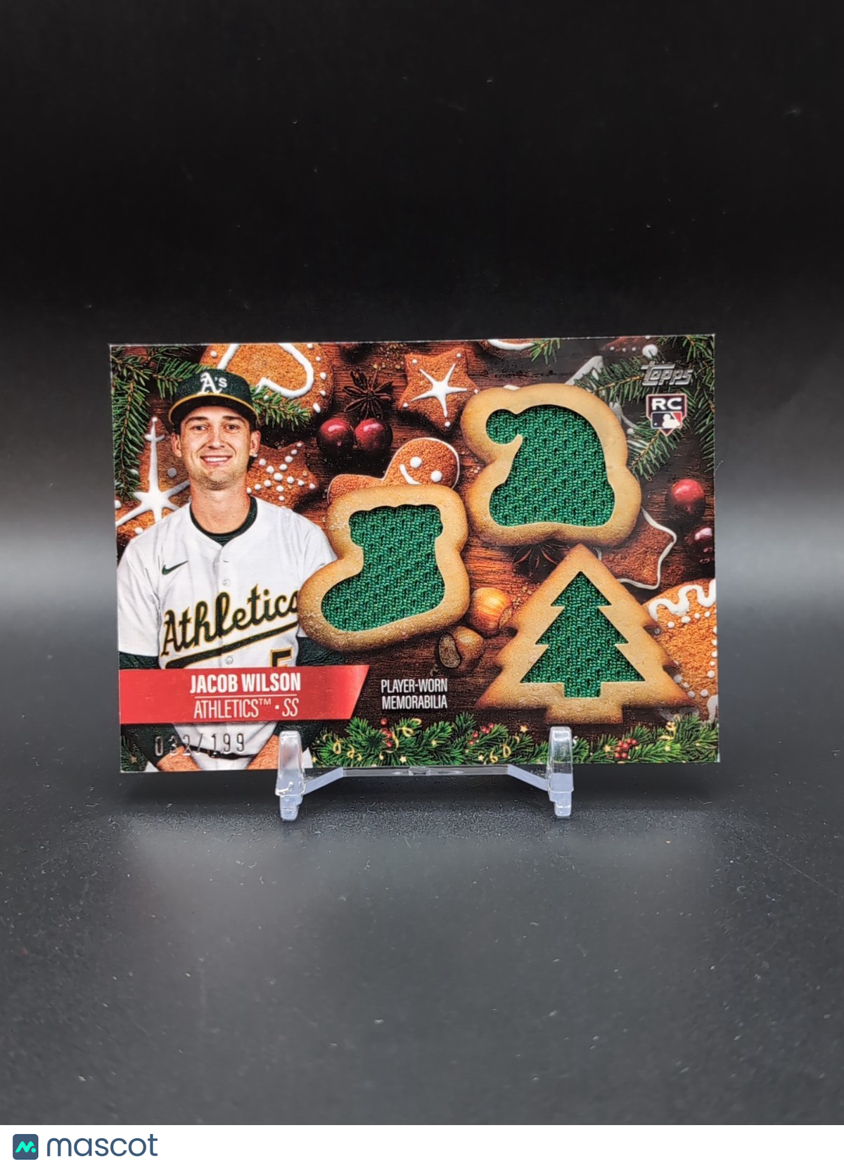 The 2025 Topps Holiday Jacob Wilson Triple Patch /199 Rookie Card features a standard-sized card made of card stock with a thickness of 20 Pt. It is an original licensed reprint from Topps, showcasing Jacob Wilson of the Oakland Athletics baseball team. This sports trading card includes patches and is limited to only 199 copies, making it a sought-after collectible for fans and collectors alike. The card is in English language and is part of the 2025 Topps Holiday set, highlighting the rookie season of Jacob Wilson. Listed With Mascot.