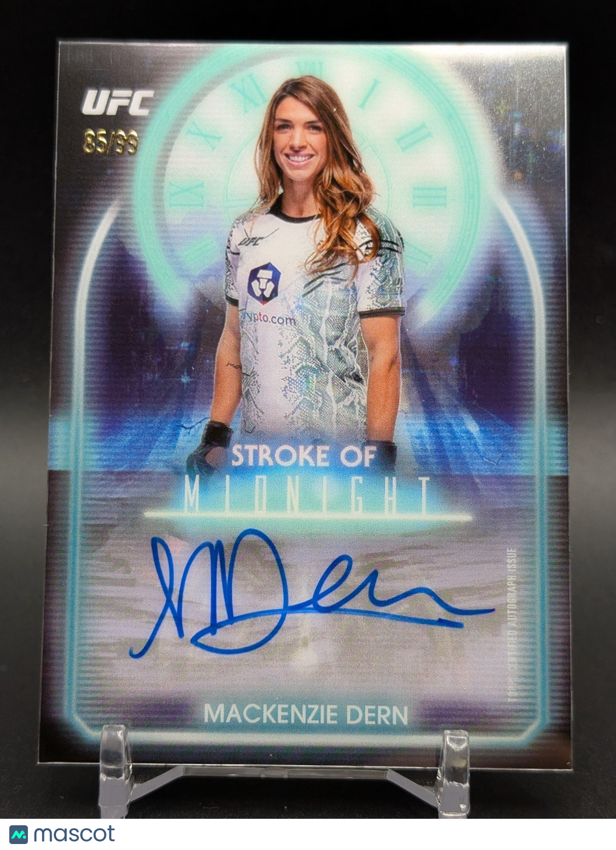 The product is a 2025 Topps Midnight UFC Mackenzie Dern Twilight Stroke of Midnight autographed trading card numbered out of 99. This card features Mackenzie Dern, a female MMA fighter in the UFC, as part of the 2025 Topps set manufactured by Topps. The card is a collectible item for fans of mixed martial arts and the Ultimate Fighting Championship league, making it a valuable addition to any sports trading card collection. Listed With Mascot.