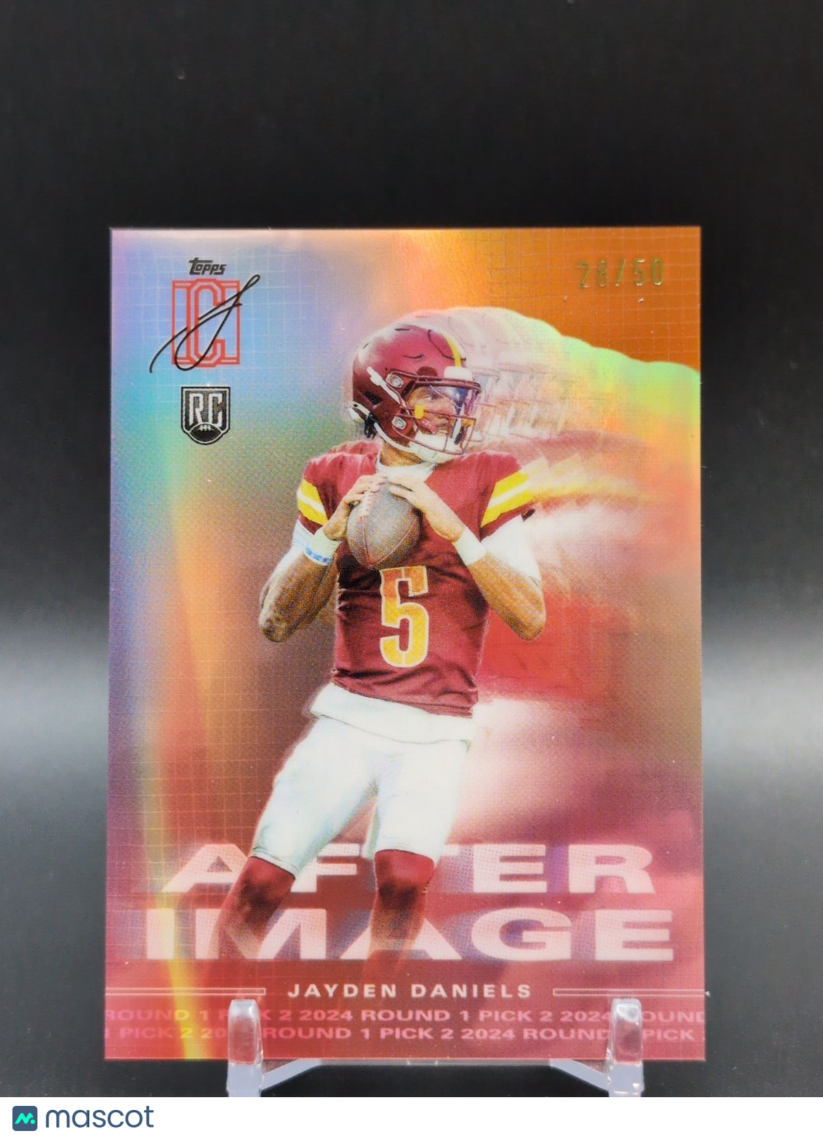 The product is a 2025 Topps Signature Class Jayden Daniels After Image Orange trading card numbered out of 50. This football sports trading card features the rookie athlete Jayden Daniels and is manufactured by Topps. As part of the Signatures set, this limited edition card is a valuable collectible item for fans and collectors of Jayden Daniels and the Washington Commanders. Listed With Mascot.