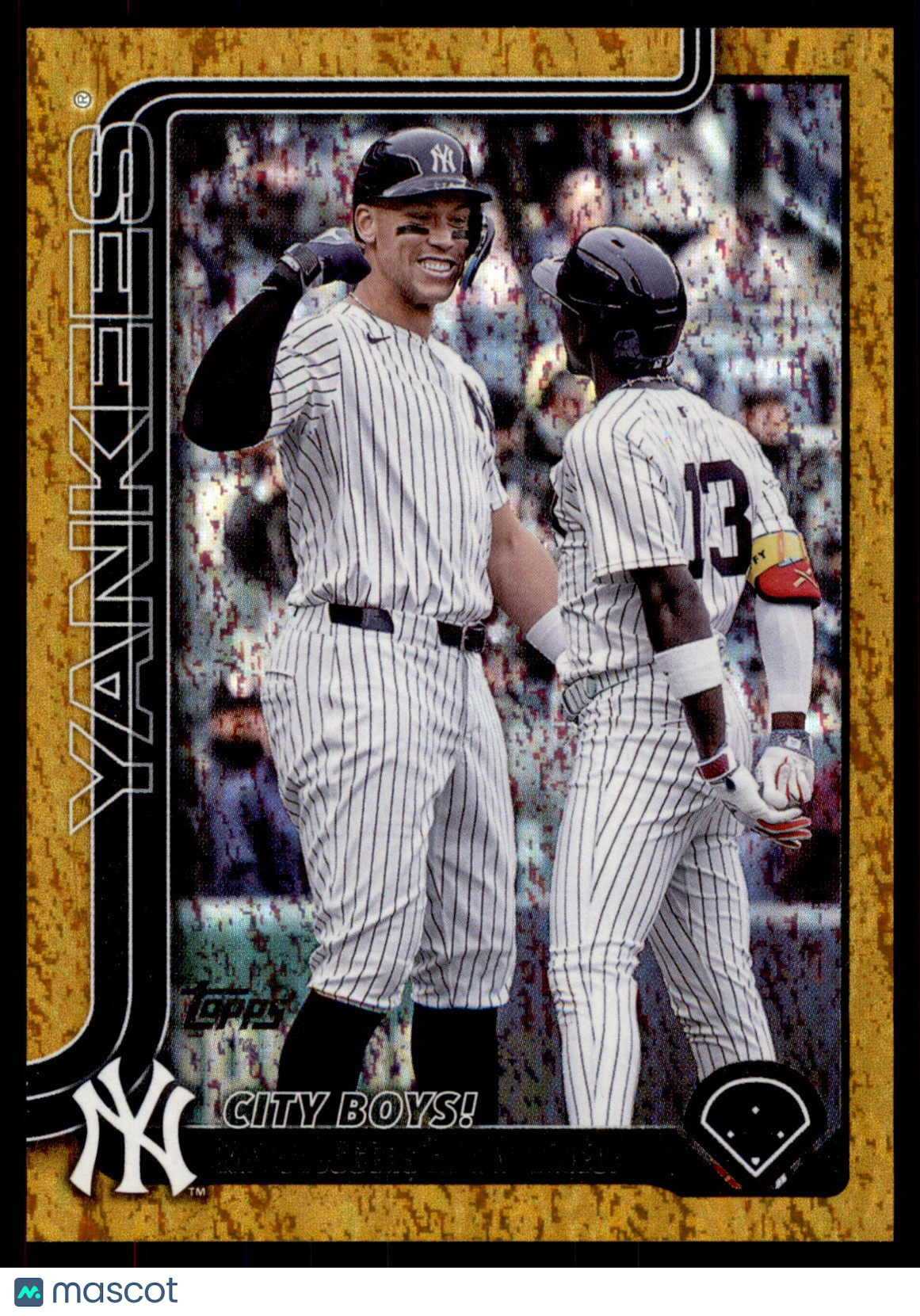 The product is a 2025 Topps Update Series Gold Foil trading card featuring Veteran Combos of Major League Baseball players including Aaron Judge of the New York Yankees. This limited edition card is numbered US85 and has a thickness of 20 Pt. Manufactured by Topps, it is a valuable collectible for fans of baseball and sports trading cards. The card is in English and is part of the 2025 Topps Update Series set, making it a sought-after item for collectors looking to add unique and exclusive pieces to their collection. Listed With Mascot.