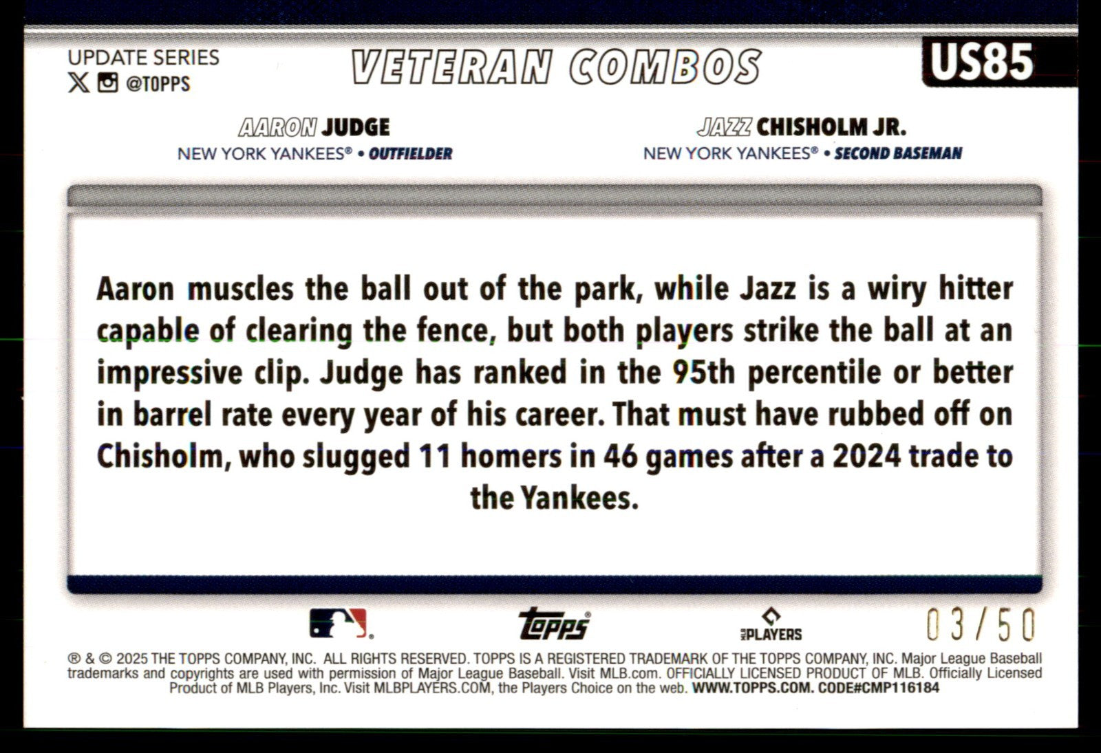 2025 Topps Update Gold Foil /50 Veteran Combos US85 Aaron Judge Jazz Yankees