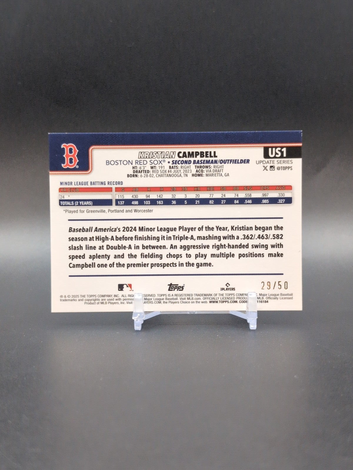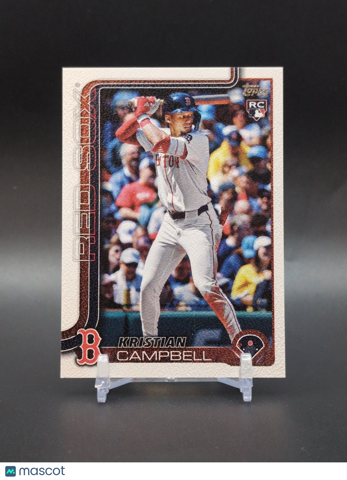 The product is a 2025 Topps Update trading card featuring Kristian Campbell, a rookie player for the Boston Red Sox. This card is a limited edition Canvas Parallel with a print run of only 50. It is a valuable collectible for fans of baseball and trading card enthusiasts alike. Listed With Mascot.