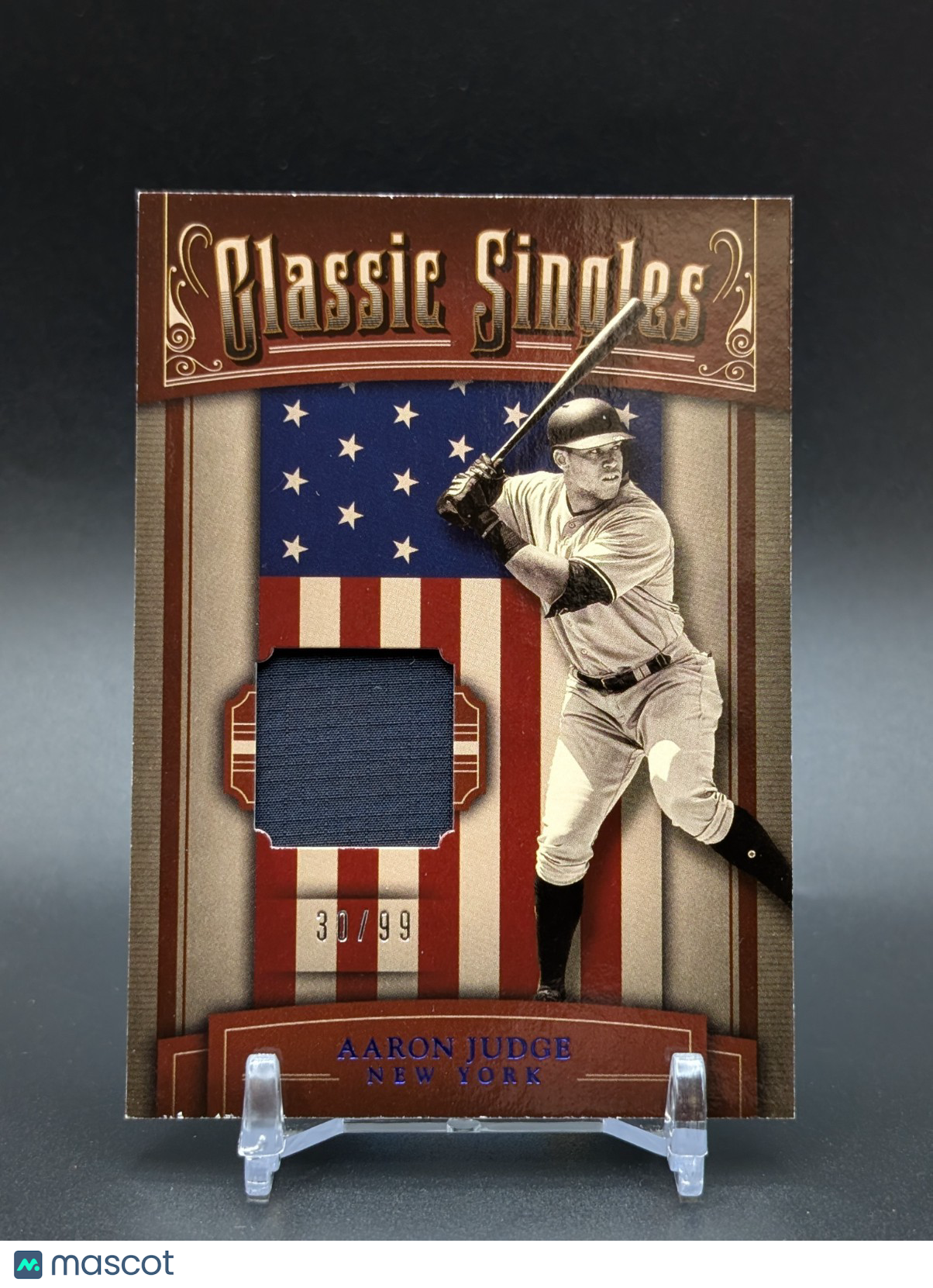 The product is a 2018 Panini Classics Singles trading card featuring Aaron Judge of the New York Yankees. This particular card is a Blue Jersey Relic numbered out of 99, adding a unique memorabilia element to the collectible. The card is printed on 108 Pt. card stock and is part of a limited print run of 149. This baseball trading card is an original licensed reprint by Panini, making it a desirable item for fans and collectors of Major League Baseball memorabilia. Listed With Mascot.