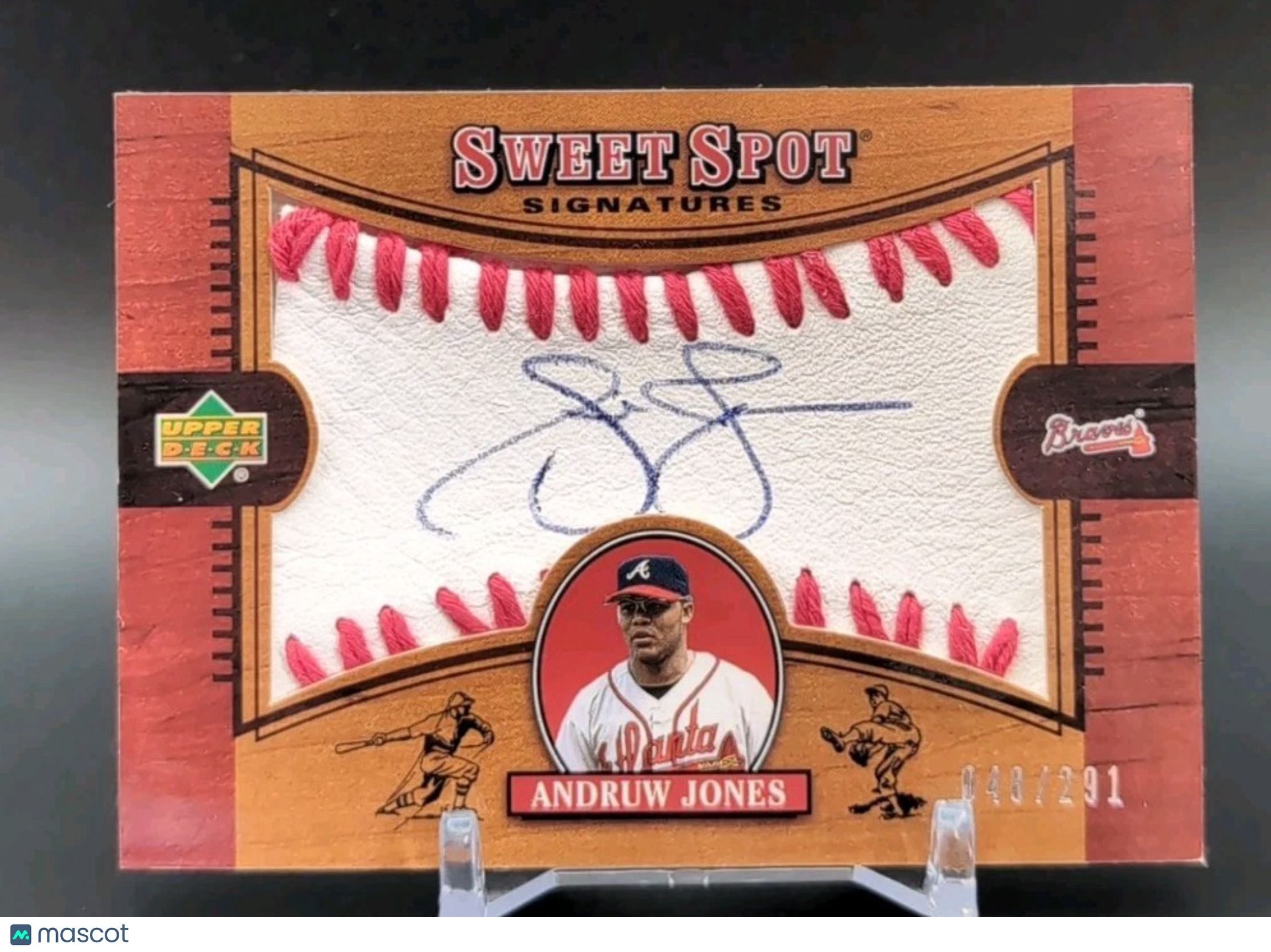 The product is a 2002 Upper Deck Sweet Spot Signatures autographed card of Andruw Jones, numbered /291. This rare sports trading card is part of the Hollywood Collectibles set, manufactured by Upper Deck. It features a signature from the player himself, making it a valuable and sought-after collectible item for fans of the Braves and Andruw Jones. Listed With Mascot.