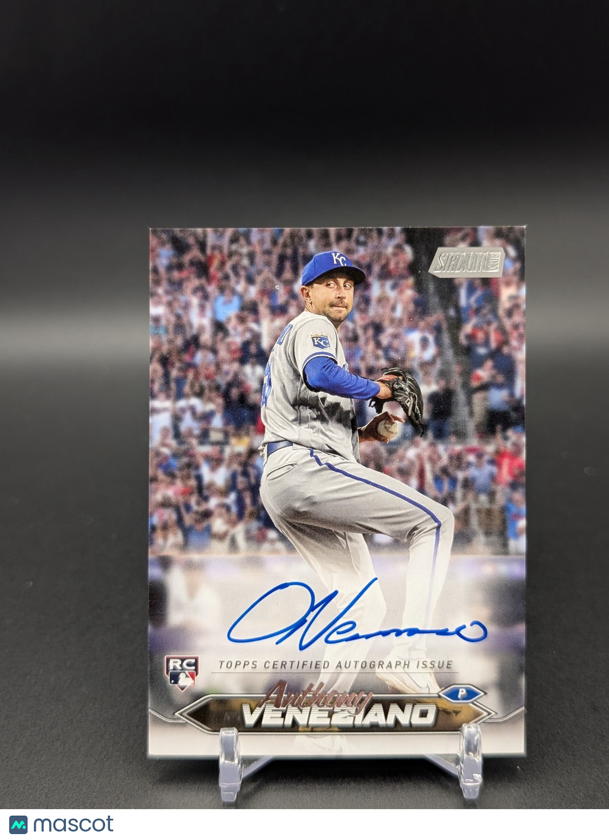 Capture a piece of baseball history with the Anthony Veneziano 2024 Topps Stadium Club Baseball Rookie Card, featuring the coveted Signatures parallel. This card, numbered SCBA-AV, showcases the promising talent of Veneziano with the Kansas City Royals, immortalized in the prestigious Topps Stadium Club set. For collectors and fans alike, the card offers an authentic autograph from Veneziano himself, adding a personal touch to this unique keepsake. Whether you're looking to bolster your collection or commemorate a rising star in the Major League, this trading card is a must-have for its significance and the thrill of the sport. Listed With Mascot.