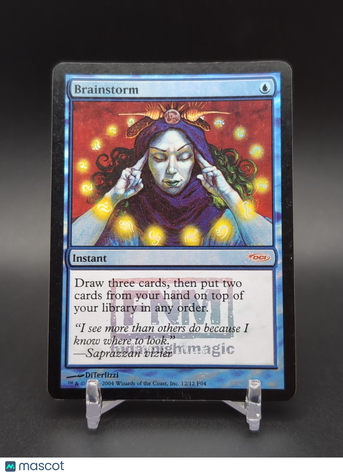 The product is a foil English card named "Brainstorm" from the Magic: The Gathering game. It is a promotional card from the FNM Promos set, illustrated by Diterlizzi and manufactured by Wizards of the Coast. This instant card has a blue color attribute and a cost of U. The foil finish adds a shiny and collectible element to the card, making it a desirable addition for Magic: The Gathering card collectors and players alike. Listed With Mascot.