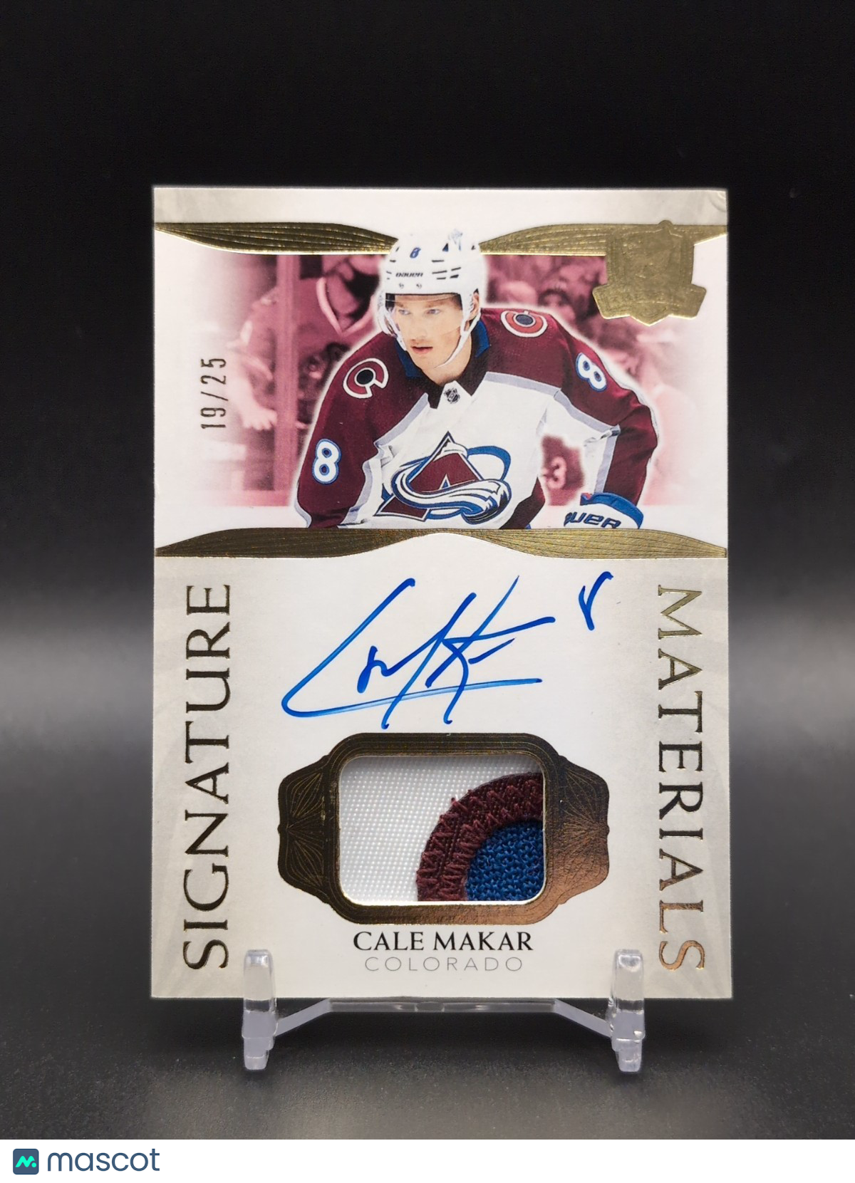The product is a highly sought-after 2021-22 Upper Deck The Cup Signature Materials Patch Autograph card featuring NHL player Cale Makar. Limited to only 25 copies, this original card includes a patch and is autographed by the player. As part of the Upper Deck manufacturer's set, this card is a valuable addition to any ice hockey trading card collection. Collectors and fans of the sport will appreciate the rarity and quality of this unique piece. Listed With Mascot.