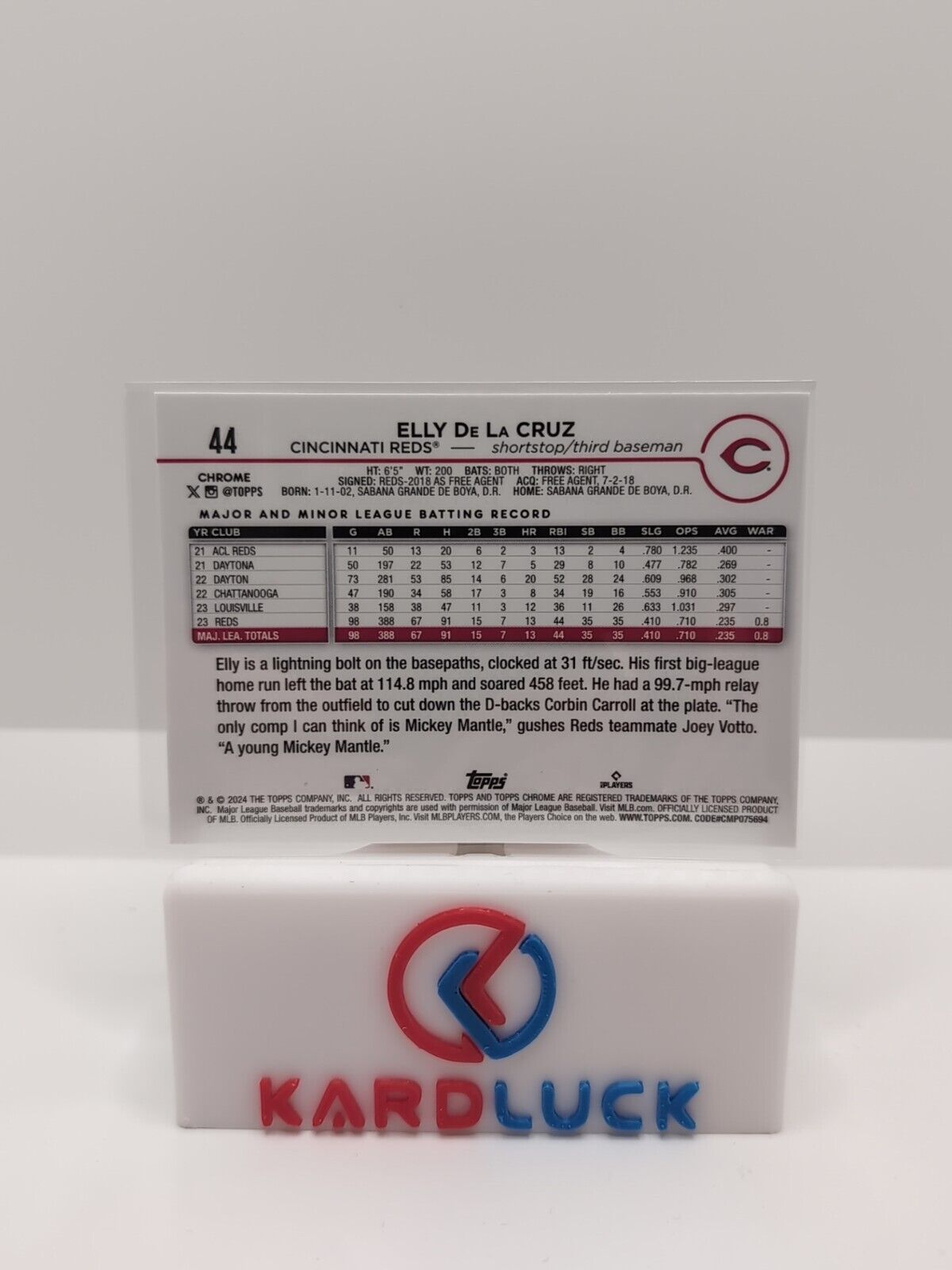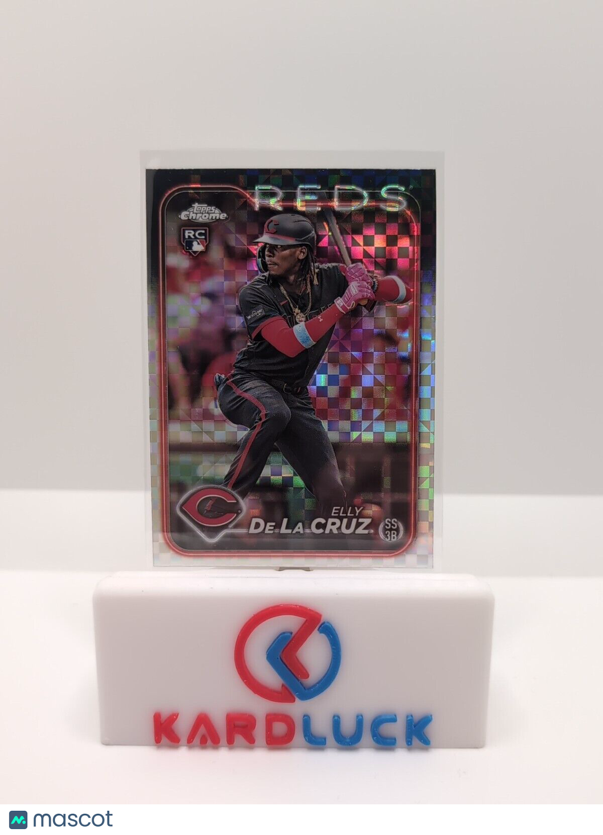This sports trading card features Elly De La Cruz, a rookie player in the 2024 baseball season. The card is part of the 2024 Topps Chrome set and has an X-Fractor parallel/variety, making it a unique addition to any collection. The card number is 44 and it is manufactured by Topps. This item is perfect for any fan of baseball trading cards or collectors looking to add a rare and valuable piece to their collection. With its sleek design and top-notch quality, this card is sure to impress. Don't miss out on the opportunity to own a piece of sports history. Listed With Mascot.