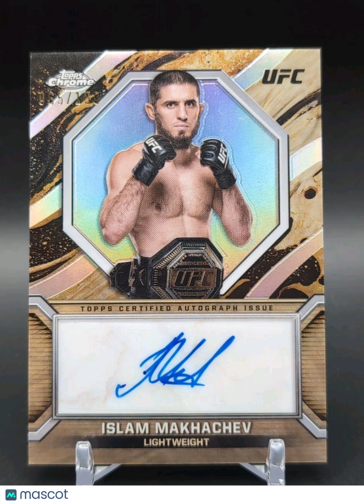 The product is a 2024 Topps Chrome Certified Mark of Champion refractor autographed trading card featuring MMA fighter Islam Makhachev. This rare card is part of the Marks of Champions Autographs insert set and is numbered out of 150. Manufactured by Topps, it is a highly sought-after collectible for fans of UFC and MMA trading cards. The autograph adds a unique and valuable element to this limited edition card, making it a prized possession for any sports card collector. Listed With Mascot.