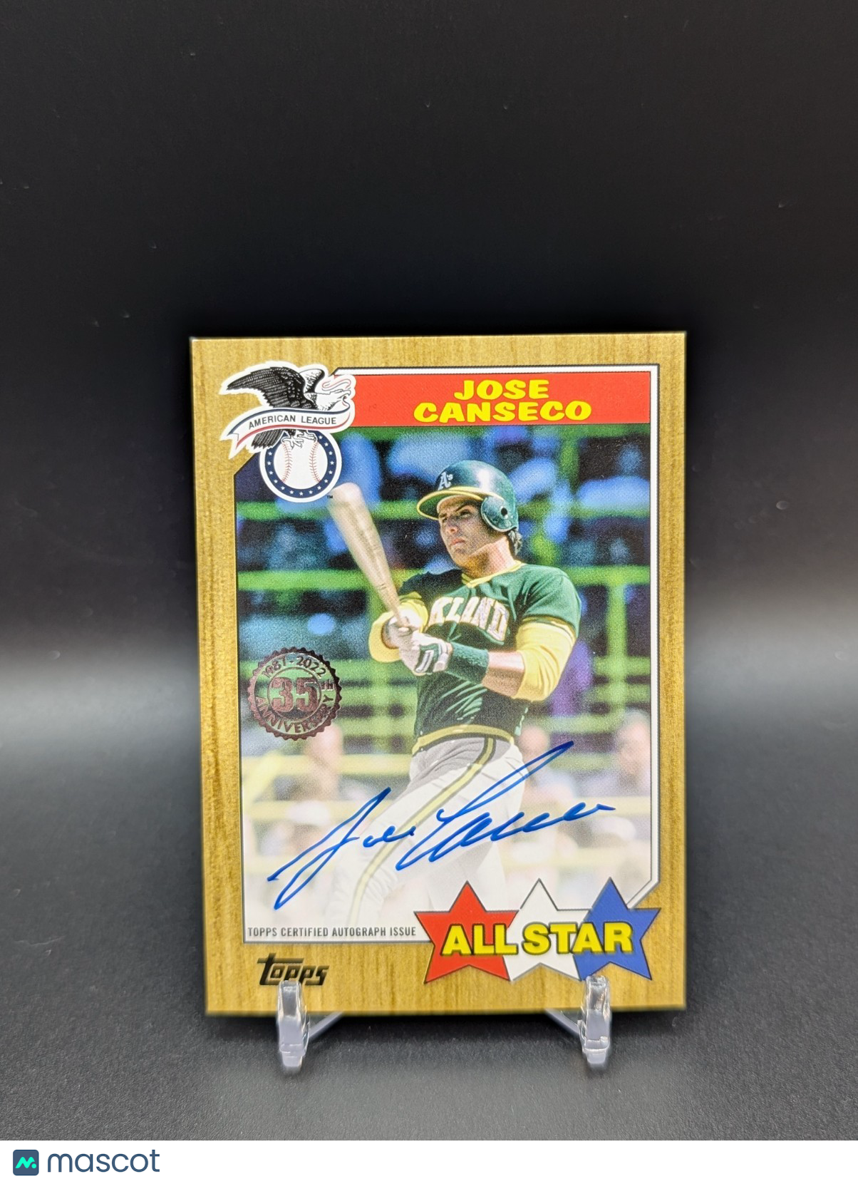 Capture a slice of baseball history with the Jose Canseco 2022 Topps '87 All-Star Autographs card, featuring the iconic Oakland Athletics slugger. Authenticated by Topps and bearing Canseco's own signature, this card is a treasured collectible for fans and collectors alike. The card is part of the 2022 Topps set, specifically the All-Star Autographs insert set, and is marked with the card number 87ASA-JCA. The card is presented in standard size with a 20 Pt. thickness, ensuring a durable and display-worthy piece. It includes a hard-signed autograph by Canseco, with the autograph authentication number 87ASA-JCA, confirming its authenticity. This collectible comes with an ultra pro magnet loader for added protection and display options. Celebrate the 1987 Major League Baseball season and Canseco's illustrious career with this original, English-language sports trading card, manufactured in the United States. Listed With Mascot.