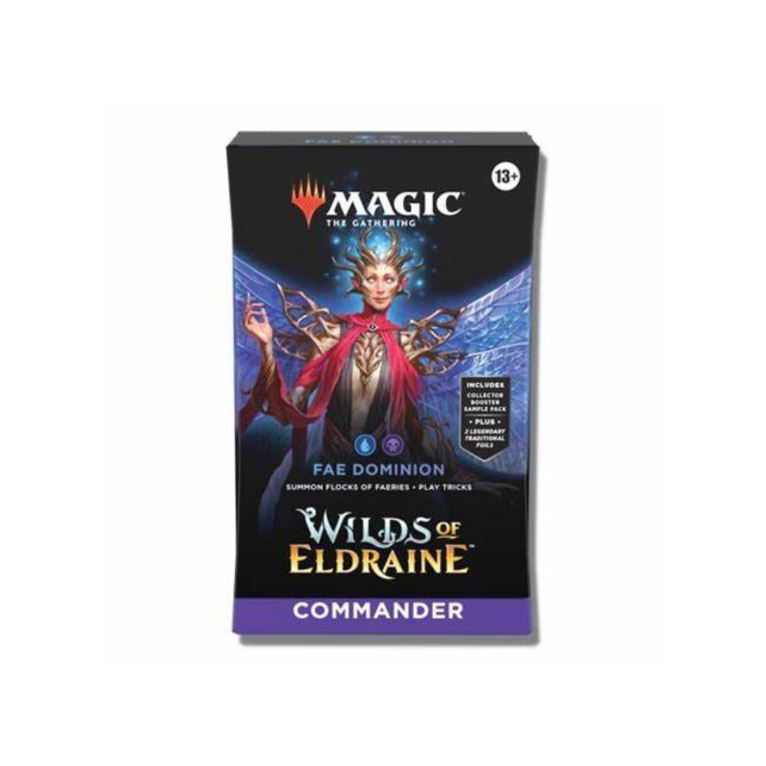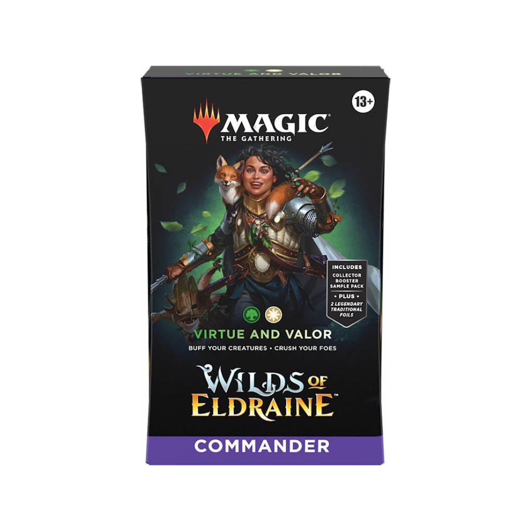 - CONTENTS—1 ready-to-play Wilds of Eldraine MTG Commander Deck (includes 2 Foil Legendary cards), a 2-card Collector Booster Sample Pack, 1 Foil-Etched Display Commander, 10 double-sided tokens, 1 life tracker, and 1 deck box