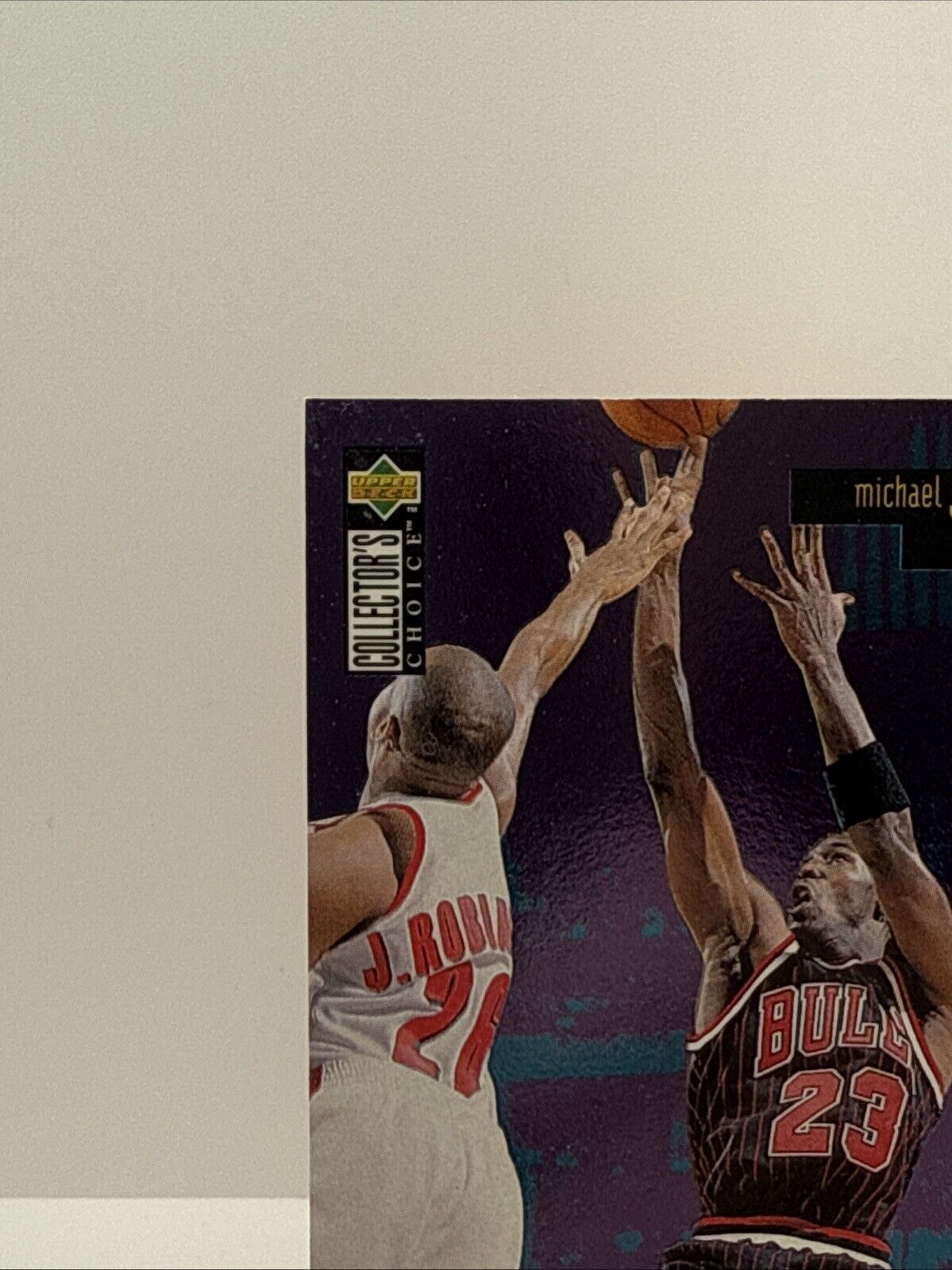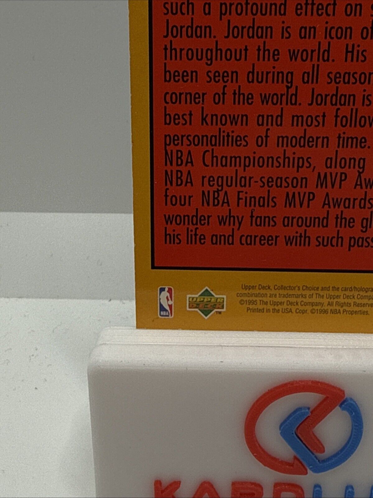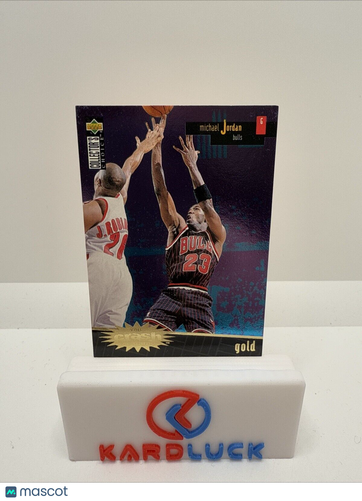 The product is a 1996-1997 Upper Deck Collector's Choice trading card featuring basketball legend Michael Jordan of the Chicago Bulls. This specific card is part of the "You Crash The Game" series and is a gold parallel variety, making it a desirable collectible for fans and collectors. Authenticated by Score, this original card showcases Jordan's scoring prowess during the 1996-1997 NBA season. A sought-after piece for fans of Jordan and basketball memorabilia enthusiasts. Listed With Mascot.
