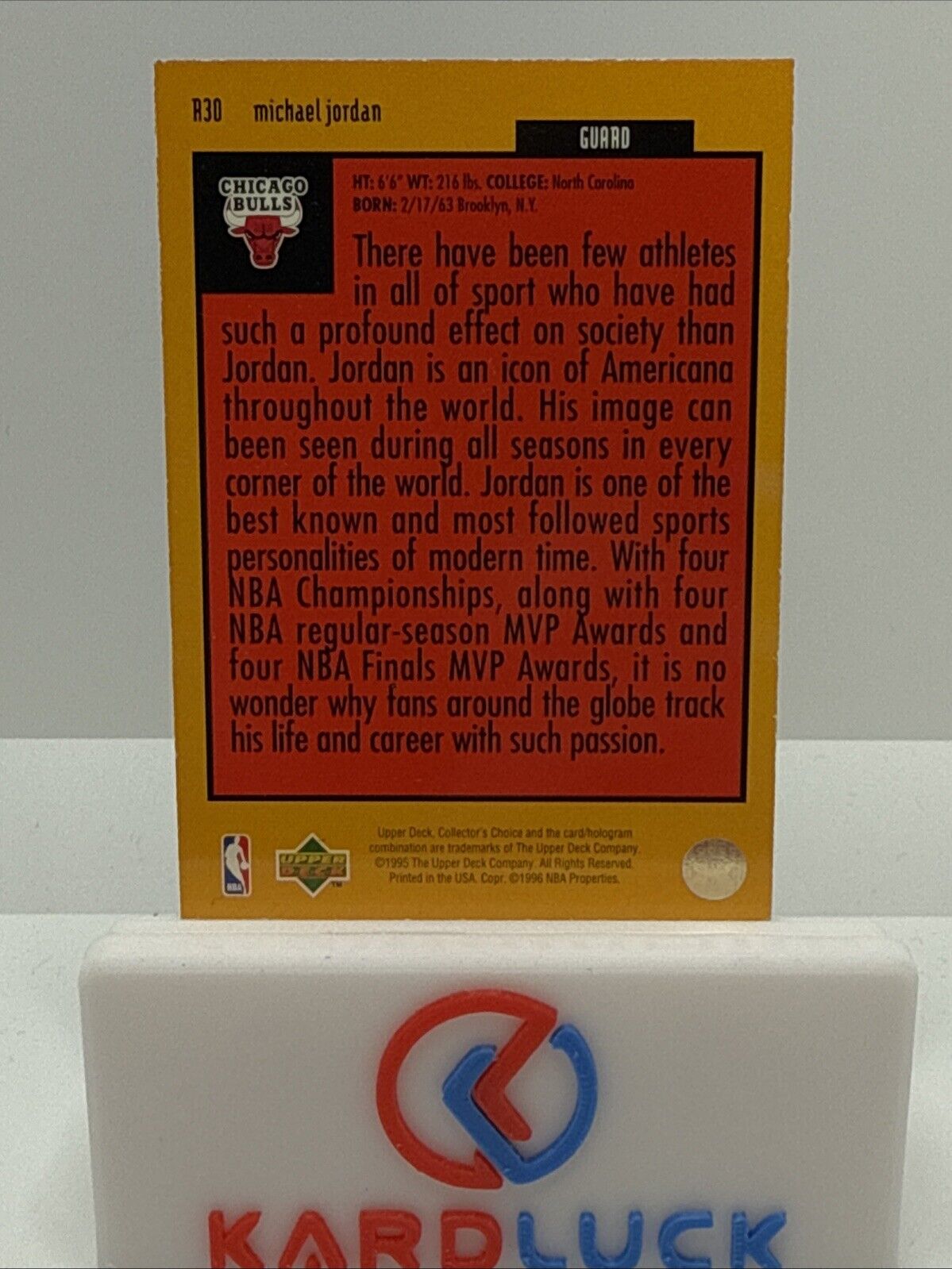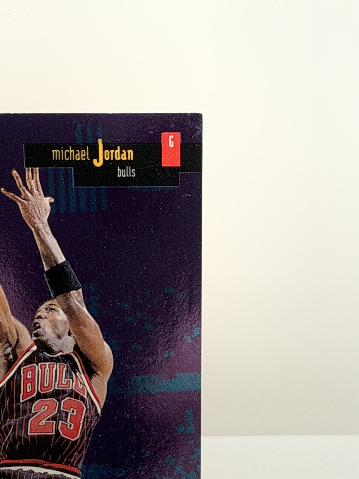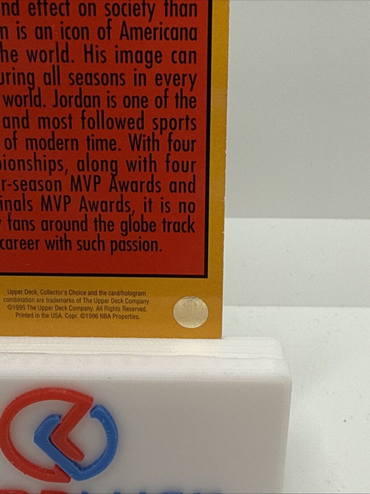 The product is a 1996-1997 Upper Deck Collector's Choice trading card featuring basketball legend Michael Jordan of the Chicago Bulls. This specific card is part of the "You Crash The Game" series and is a gold parallel variety, making it a desirable collectible for fans and collectors. Authenticated by Score, this original card showcases Jordan's scoring prowess during the 1996-1997 NBA season. A sought-after piece for fans of Jordan and basketball memorabilia enthusiasts. Listed With Mascot.