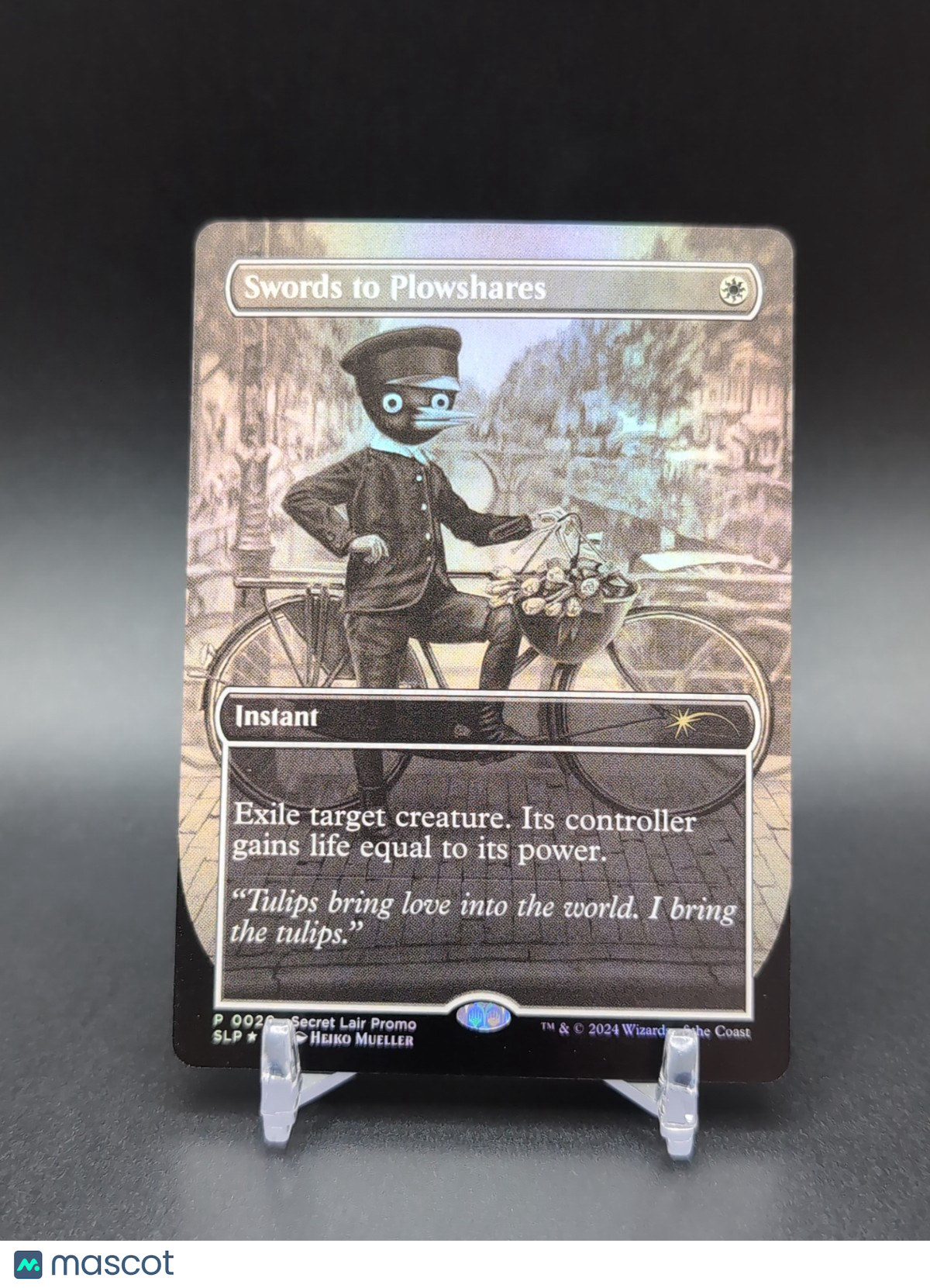 The product is a Mint/Near-Mint English Magic: The Gathering card from the Secret Lair Drop Series. The card is a foil version of Swords to Plowshares, with card number 0020. Manufactured by Wizards of the Coast, this collectible card is highly sought after by players and collectors alike for its unique abilities and rarity within the game. Its foil finish adds an extra layer of collectible value and desirability. Listed With Mascot.