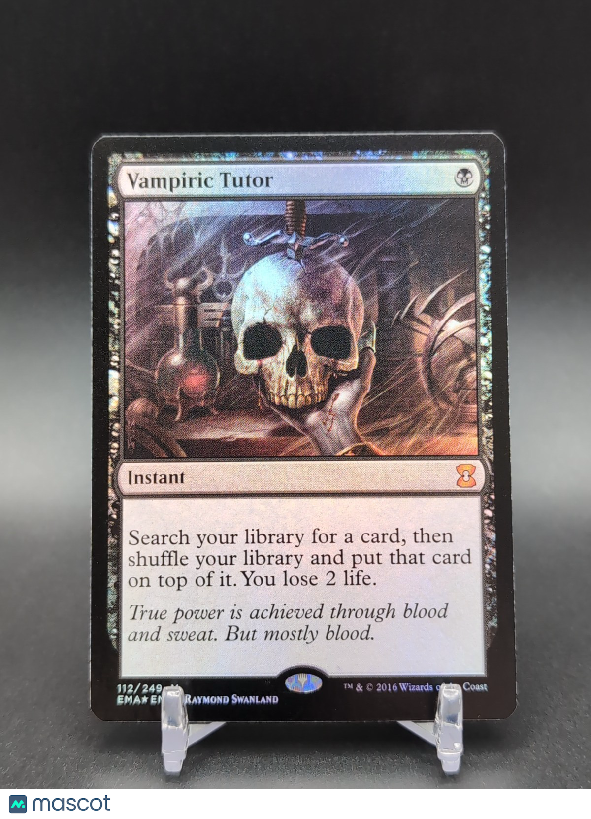 The MTG Dominaria Remastered #108 Vampiric Tutor Foil card is a black instant card featuring a vampires creature type from the Dominaria Remastered set. Illustrated by Raymond Swanland, this mythic rare card is manufactured by Wizards of the Coast and is in English language. The foil finish adds a special shine to the standard-sized card, making it a sought-after collectible for Magic: The Gathering enthusiasts aged 13 and up. With its unique attributes and rarity, this card is a valuable addition to any card collection. Listed With Mascot.