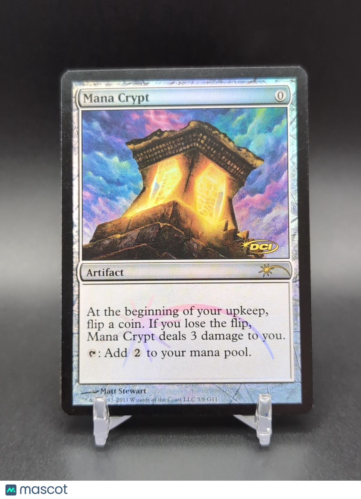 The product is a foil Magic: The Gathering kids Mana Crypt card from the Judge Promos set. This colorless artifact card, featuring illustrations by Matt Stewart, is a promotional item manufactured by Wizards of the Coast. The English language card has a standard size and is made of card stock with a foil finish, making it a sought-after collectible for fans of the game. Listed With Mascot.