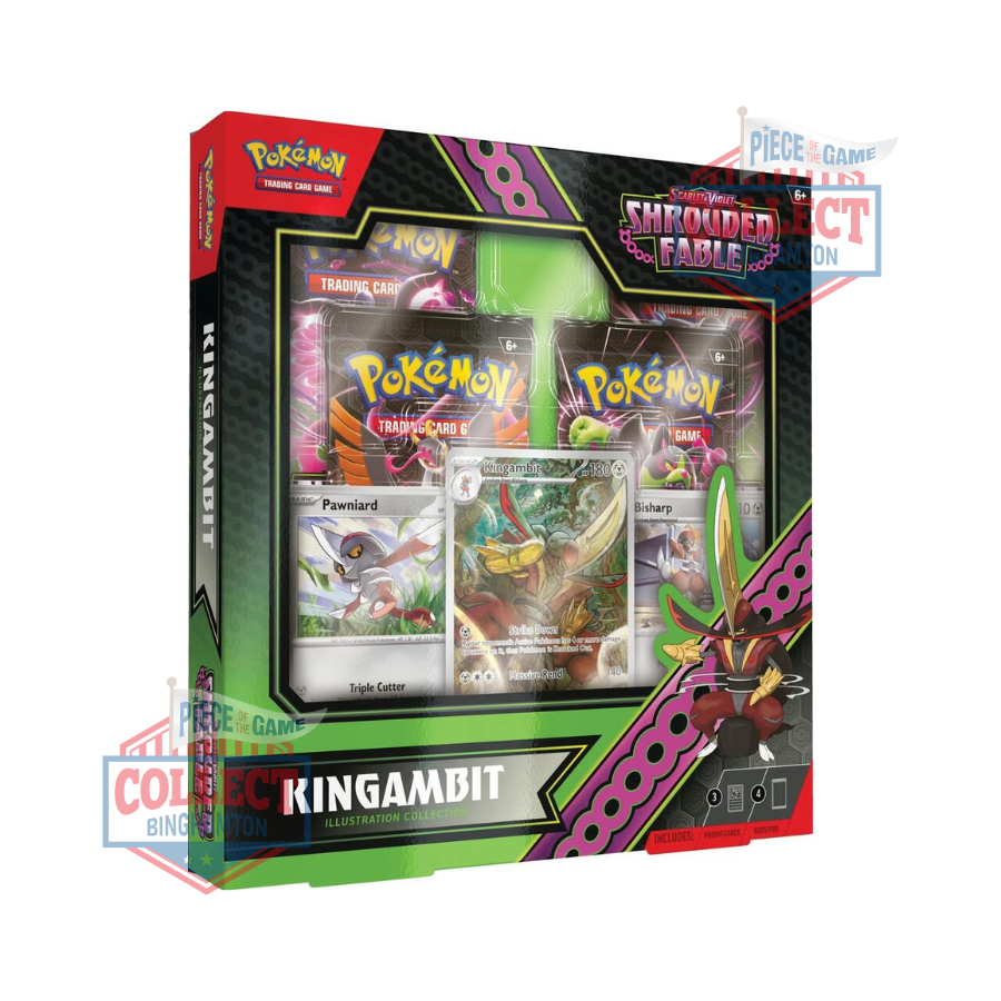 Kingambit overcomes all challengers to become the leader of its own army! With this noble collection, you can add the Big Blade Pokémon to your team as an illustration rare-style promo card, joined by foil cards featuring Pawniard and Bisharp. You’ll also find four booster packs from the special Scarlet & Violet—Shrouded Fable expansion!