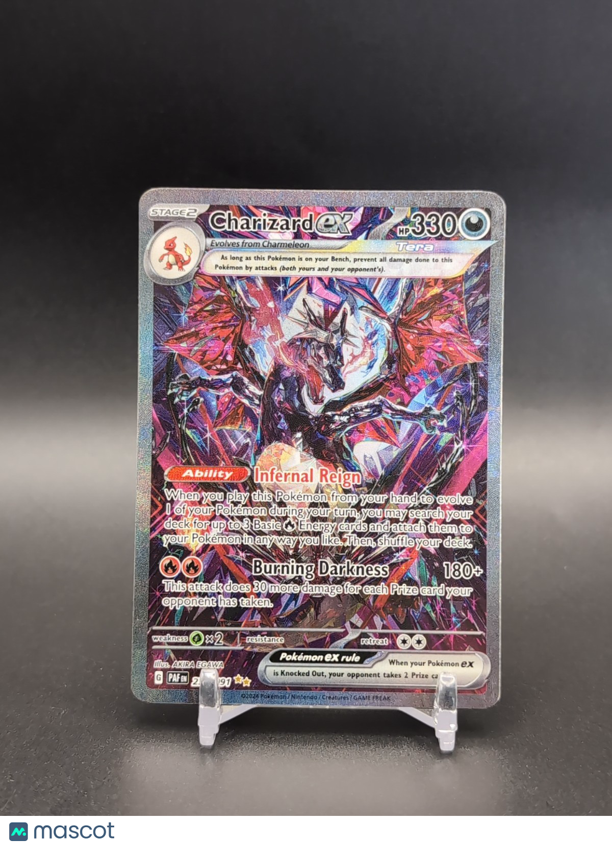 The Pokémon TCG Charizard EX SIR 234/091 from the Paldean Fates set is an ultra rare full art card featuring the popular character Charizard. Manufactured by The Pokémon Company in the United States, this darkness attribute card is part of the Pokémon TCG game. With a dragon creature type and standard card size made of card stock, this 2024 release is suitable for ages 6 and up. This English language card is a valuable addition to any collector's deck, offering unique features and a special EX specialty. Listed With Mascot.