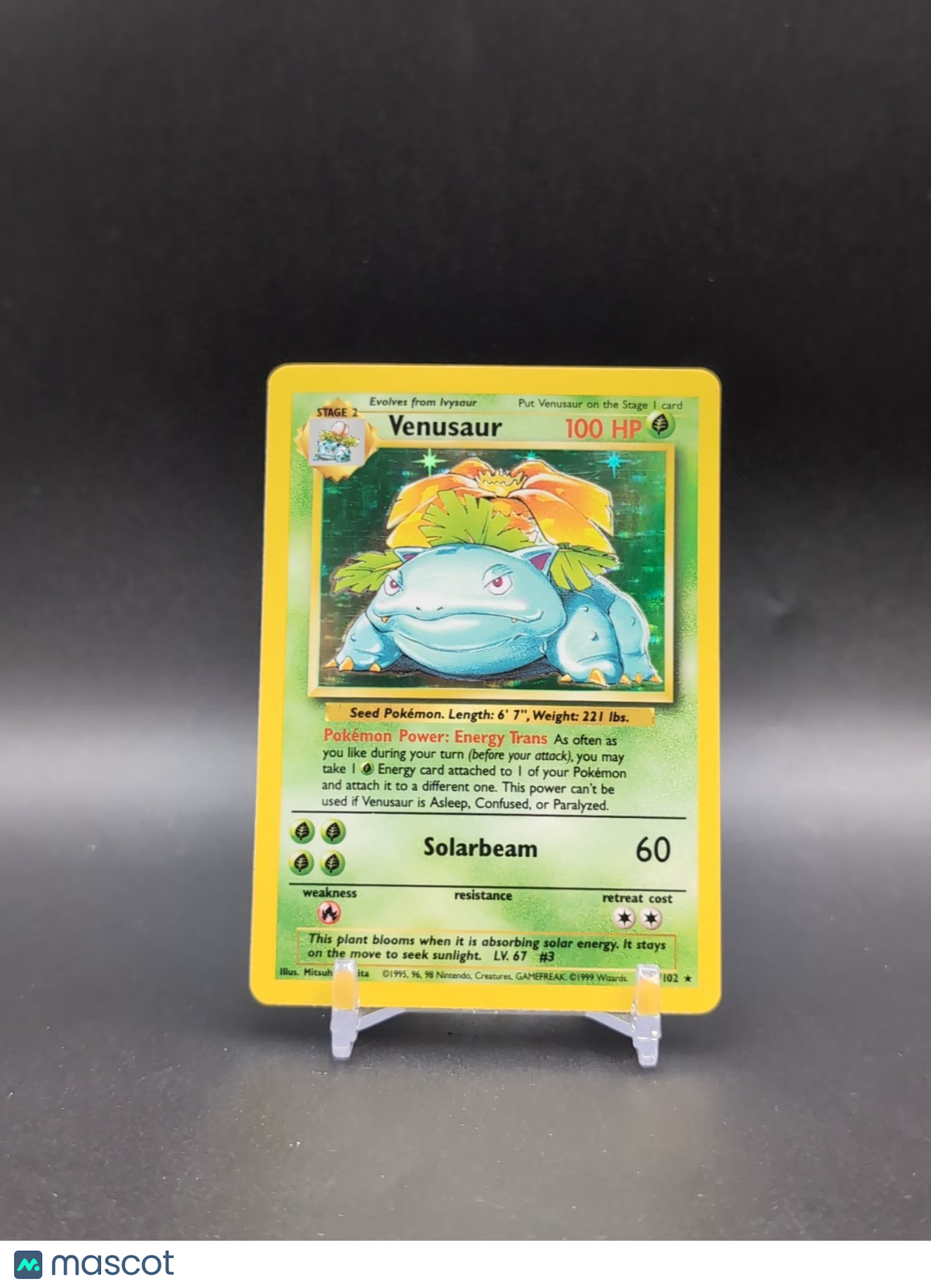 The product is a Pokémon TCG Venusaur card from the Base Set, featuring the character Venusaur with 100 HP. It is a Holo Rare card illustrated by Mitsuhiro Arita, manufactured by The Pokémon Company. This English-language card is a Stage 2 Pokémon card with the card number 015/102, making it a sought-after collectible for fans of the Pokémon Trading Card Game. Listed With Mascot.