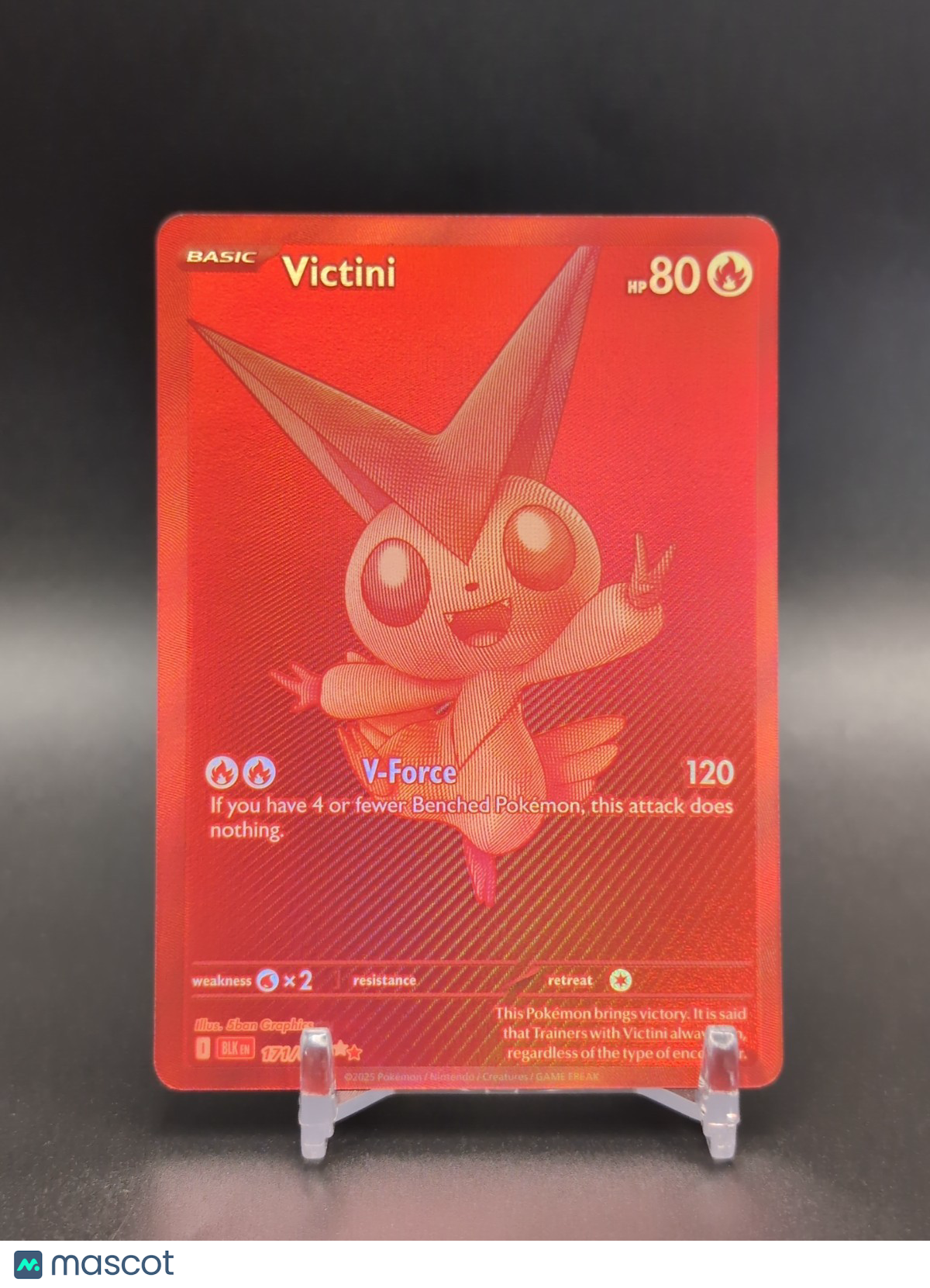 The Pokemon Victini 171/086 Sv: Black Bolt Holo card is a Red-colored Beast-type Pokemon with 80 HP. Manufactured by The Pokemon Company in the United States, this English-language card features a Full Art design and a Black White Rare rarity. With its holographic finish, this Basic stage Pokemon card is a sought-after collectible for fans of the Pokemon Trading Card Game. Autographed by Ryo Ueda, this standard-sized card is perfect for players aged 6 and above. Listed With Mascot.