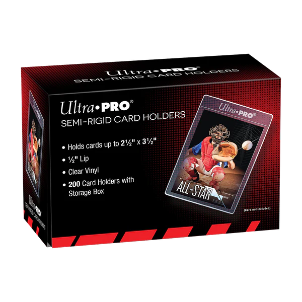 Protect your valuable trading card and gaming cards with Ultra PRO's Semi-Rigid card holding sleeves. These thin yet sturdy sleeves are easy to ship and provide added structural integrity to your card for storage and during shipping. Designed with a 1/2" lip for easy handling and made with clear PVC, these holders store trading cards and gaming cards up to 2-1/2" x 3-1/2" (63.5mm x 88.9mm) in size and up to 35 points in thickness. Each box comes with 200 individual Semi-Rigid sleeves.