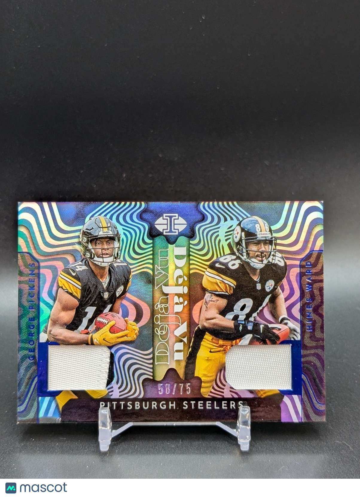 Capture a piece of football history with the 2022 Panini Illusions Relic Single Card featuring the dynamic duo of George Pickens and Hines Ward. As part of the revered Pittsburgh Steelers team set, this card holds a special connection for fans, showcasing the legacy of two celebrated athletes from the 2022 season. The card, numbered DV-PI and limited to just 75 copies, is a must-have for collectors and enthusiasts alike. Crafted with precision, this sports trading card is a testament to the durability and quality Panini is known for. The card's design highlights the modern era of football, presenting an original piece that is both visually appealing and a valuable addition to any NFL collection. Dive into the world of sports memorabilia with this exceptional piece that celebrates the spirit and thrill of the game. Listed With Mascot.