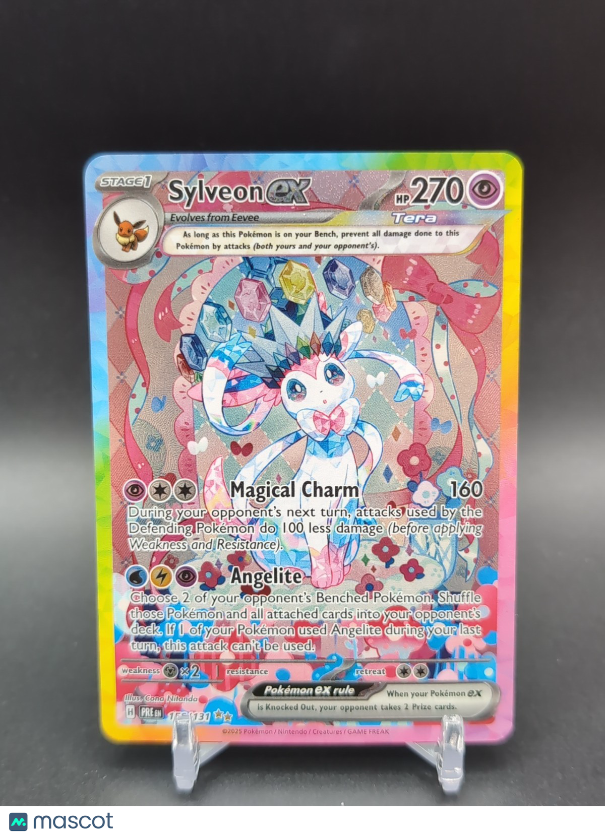 The product is a Sylveon EX card from the Pokemon TCG set Prismatic Evolutions. This collectible card features the character Sylveon with a holographic finish, making it a speciality EX card manufactured by Pokemon. The card is numbered 156 out of 131 in the set, adding to its rarity and value among collectors of CCG individual cards. Listed With Mascot.
