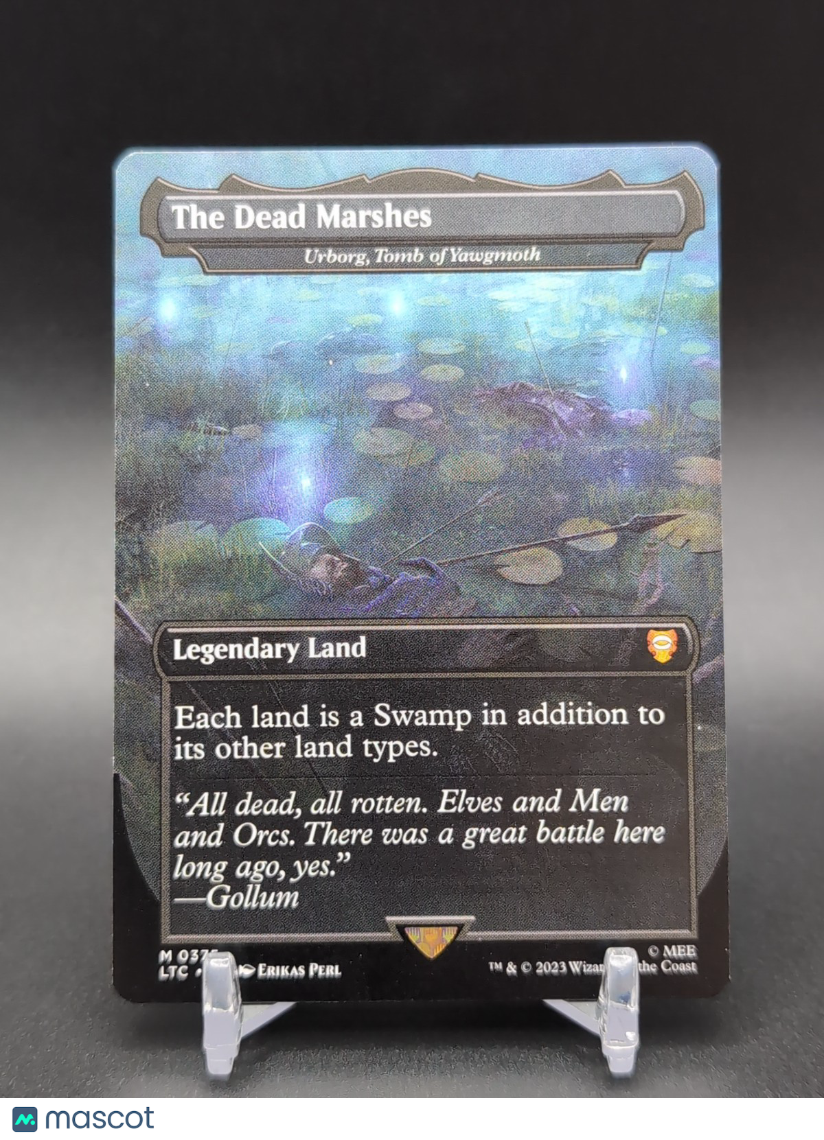 The Dead Marshes - Urborg, Tomb of Yawgmoth is a Mythic rarity Legendary land card from the Commander: the Lord of the Rings set of Magic: The Gathering. Manufactured by Wizards of the Coast in 2023, this Colorless card features borderless artwork by illustrator Erikas Perl. With a cost of B and the unique ability to turn any land into a Swamp in addition to its other land types, this card is a valuable addition to any Magic: The Gathering collection for players aged 13 and up. Made from durable card stock, this English-language card is a must-have for fans of the Lord of the Rings universe. Listed With Mascot.