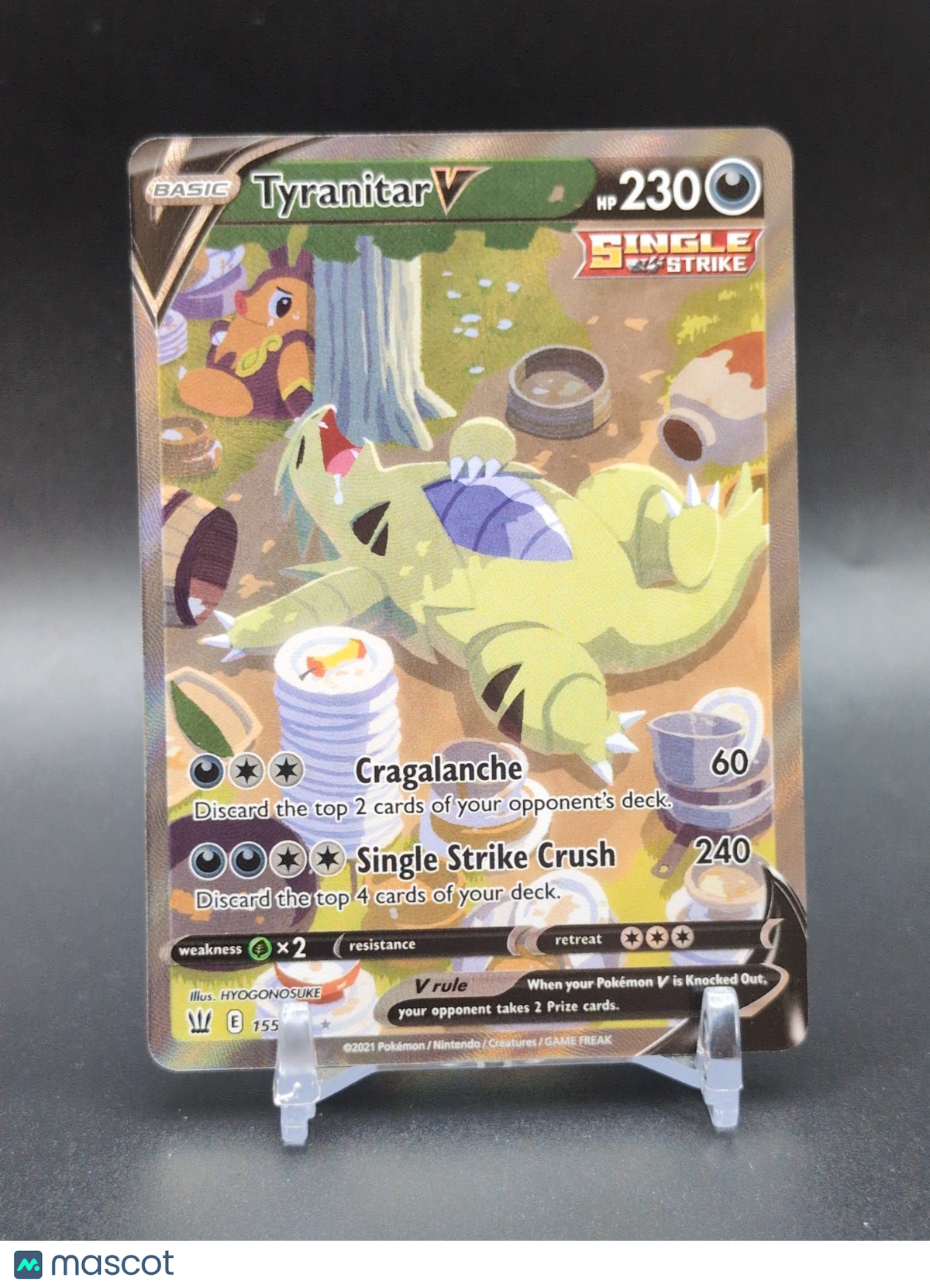 The Tyranitar V (Alternate Full Art) Ultra Rare card from the Pokémon TCG set Swsh05: Battle Styles is a highly sought-after collectible for fans and collectors alike. Manufactured by The Pokémon Company, this English-language card features a stunning Full Art design with a Holo finish, making it a prized addition to any card collection. With its unique Darkness attribute and rarity as an Ultra Rare card, this Tyranitar V (Alternate Full Art) card is sure to be a standout piece for any Pokémon TCG enthusiast. Listed With Mascot.