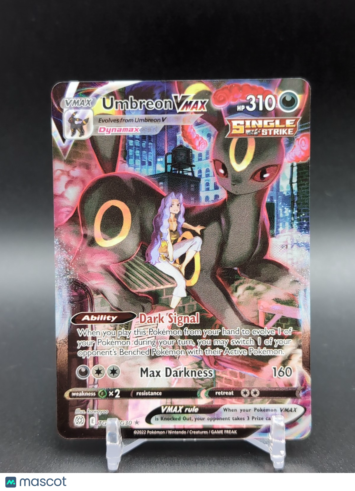 The Umbreon VMAX card from the Swsh09: Brilliant Stars Trainer Gallery set is a highly sought-after Ultra Rare collectible card in the Pokémon TCG. Illustrated by kawayoo, this English-language card features a stunning Holo finish and a high HP of 310. As a Pokémon card with the Vmax stage, it is a powerful addition to any collector's or player's deck. Manufactured by The Pokémon Company, this card is a valuable and eye-catching piece for fans of the game. Listed With Mascot.