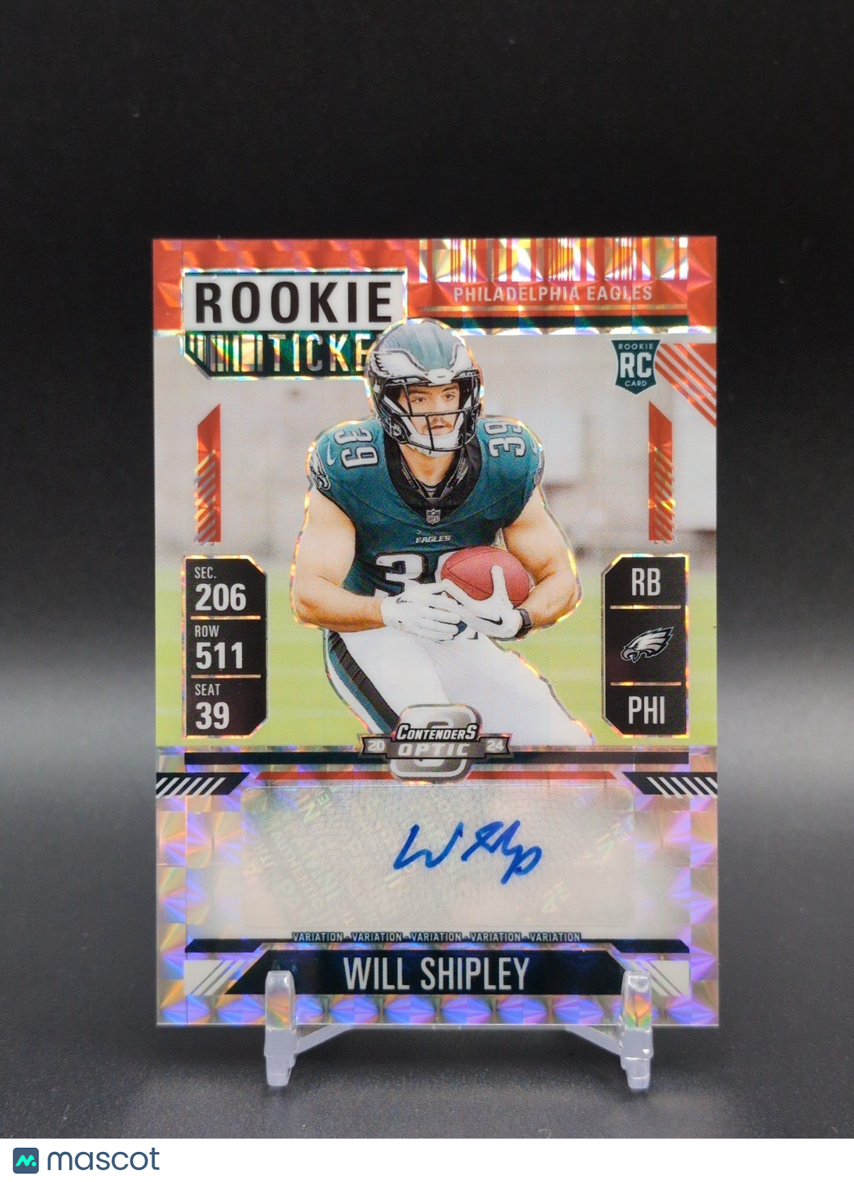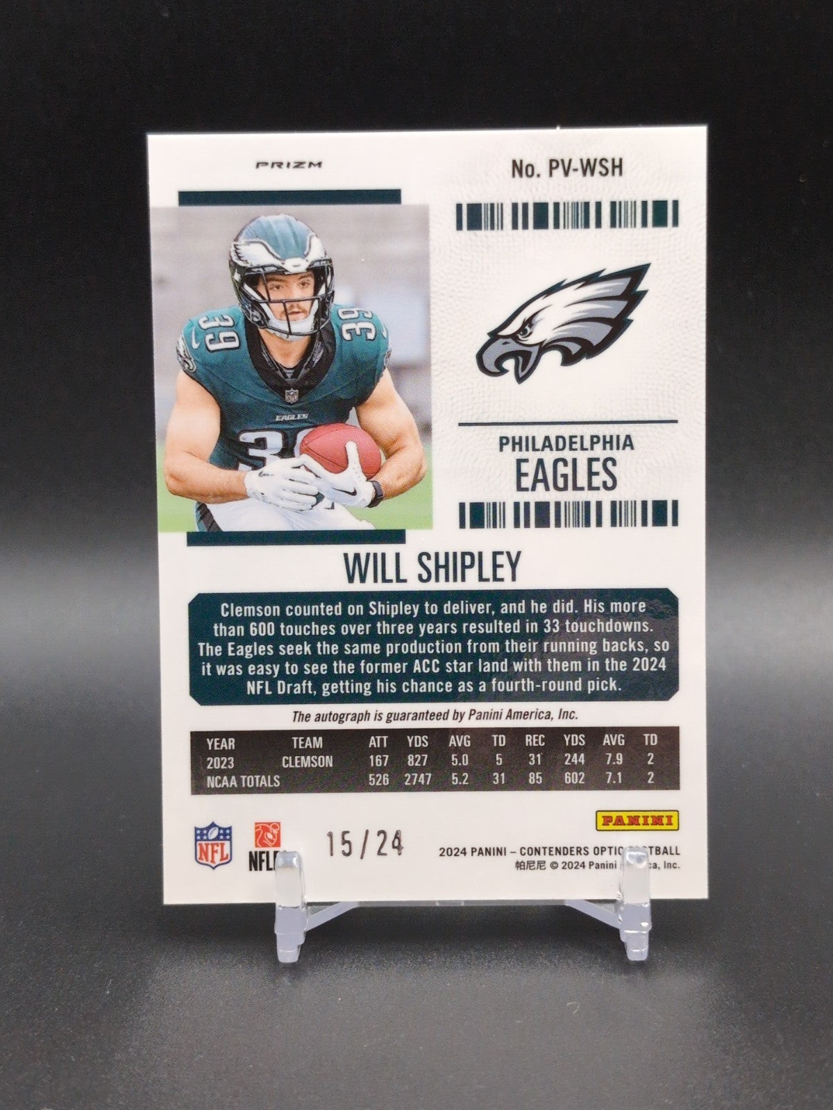 The Will Shipley 2024 Panini Zenith SP RC Contenders Optic Preview Auto /24 Eagles trading card is a highly sought-after collectible for fans of the Philadelphia Eagles and football enthusiasts. This autographed card features the rookie player, Will Shipley, from the National Football League, making it a valuable addition to any sports trading card collection. The card is limited, with only 24 copies produced, and is part of the Optic variety known for its shiny and reflective design. With its serial numbering and short print status, this card is a unique and special item for collectors looking to own a piece of football history. Listed With Mascot.