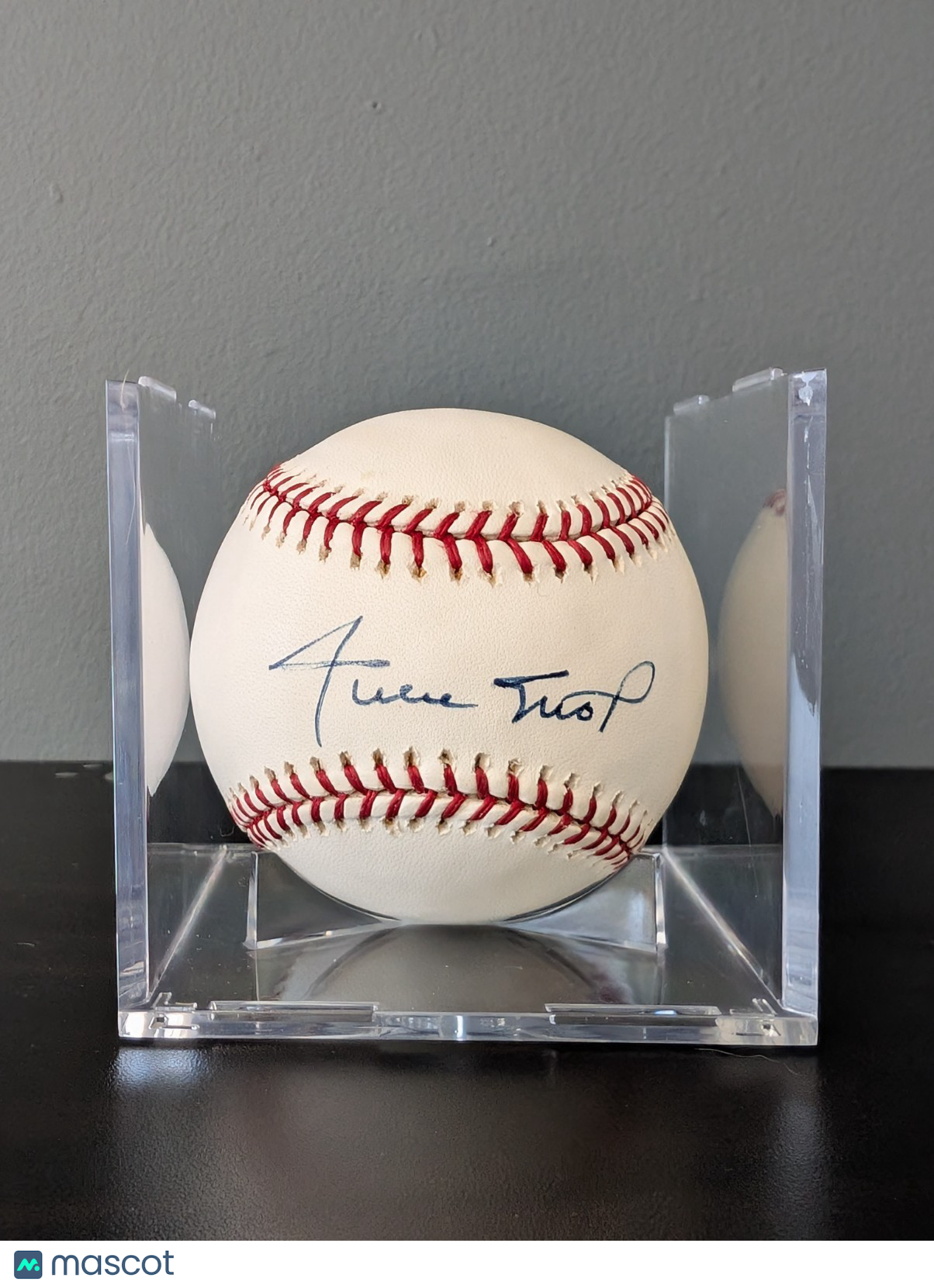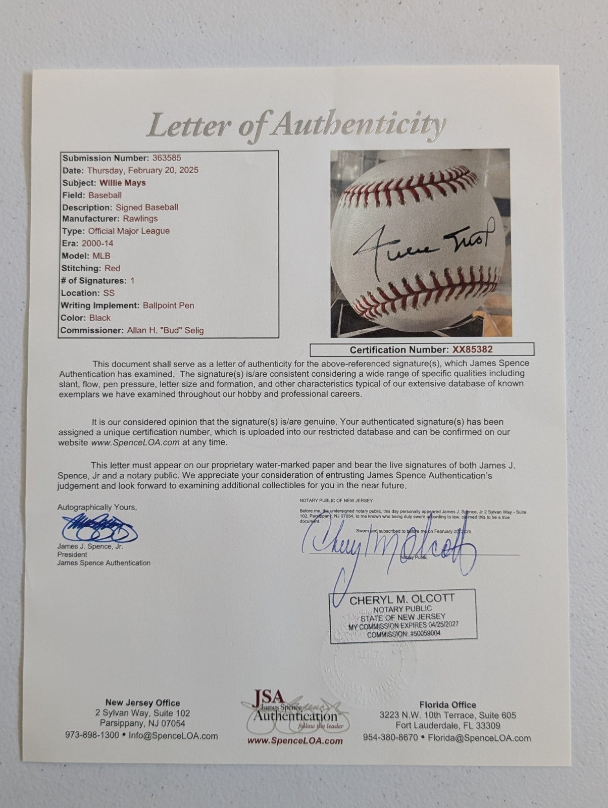 The product is an official Major League Baseball signed by legendary player Willie Mays. The autograph is authenticated by James Spence Authentication (JSA) ensuring its authenticity. This rare collectible item would be a prized possession for any baseball fan or collector, especially those who appreciate the career of Willie Mays and the San Francisco Giants. Listed With Mascot.